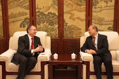 Prof Michael Arthur, President of University College London, visited Peking University (PKU) on Feb 21, 2014 Prof Wang Enge, President of Peking University, met the guests at Lin Hu Xuan