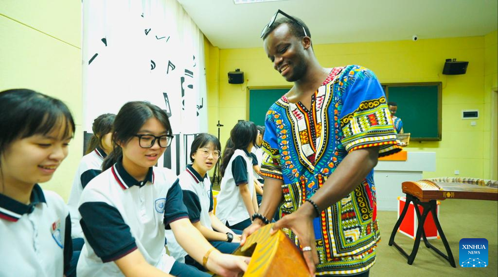 Joseph Olivier Mendo'o, executive director of the International Exchange Department at the China-Africa Business Council, introduces African culture to Chinese students during his visit to Xindeng ...