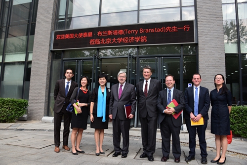 2017年9月15日下午,美国驻华大使泰里·布兰斯塔德(Terry Branstad)一行来访北大,其中包括大使办公室秘书陈南希、经济处官员巴伦·罗布斯坦、公共关系处官员亚伯拉罕·怀斯。作为经济学院105周年院庆活动之一“外国驻华大使眼中的中国经济”系列讲座的首位演讲嘉宾,布兰斯塔德大使在经济学院报告厅就“中美经济关系”发表了主题演讲。