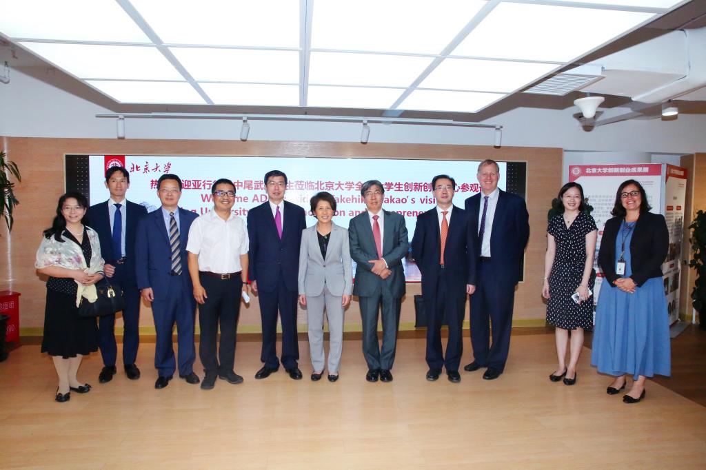 会见前,代表团一行先抵达北京大学全球大学生创新创业中心进行了参观并与企业家代表座谈。北京大学校友会秘书长李文胜及北京大学创业训练营相关工作人员热情接待了中尾武彦行长一行。