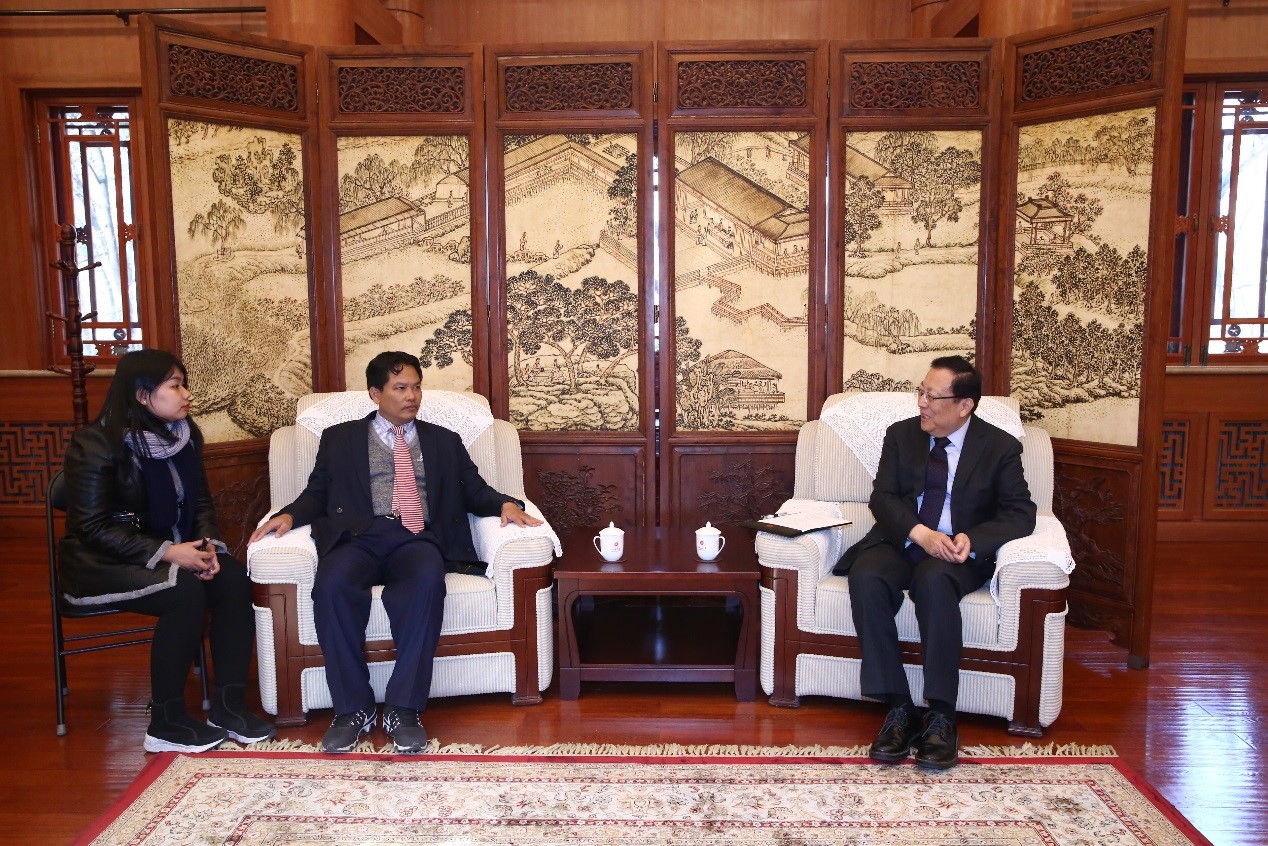 12月14日,柬埔寨皇家翰林院院长Sok Touch率领代表团来校访问,郝平校长在临湖轩会见来宾。外国语学院院长宁琦、副院长吴杰伟,国际合作部副部长严军等陪同出席了会见。