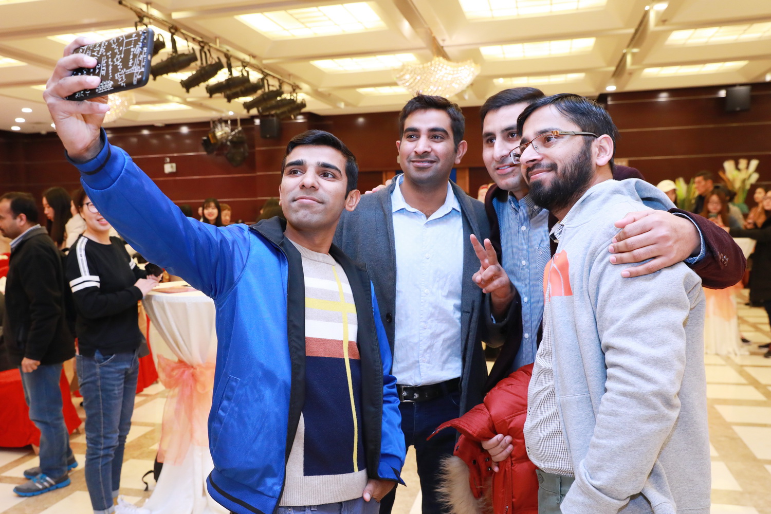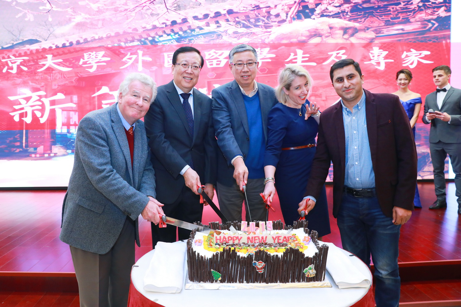 之后,郝平、田刚同外国专家代表Roger Ames教授、留学生校友代表布兰卡、留学生代表王安波(Waseem Aftab)一同切蛋糕,共庆2019新年的到来。