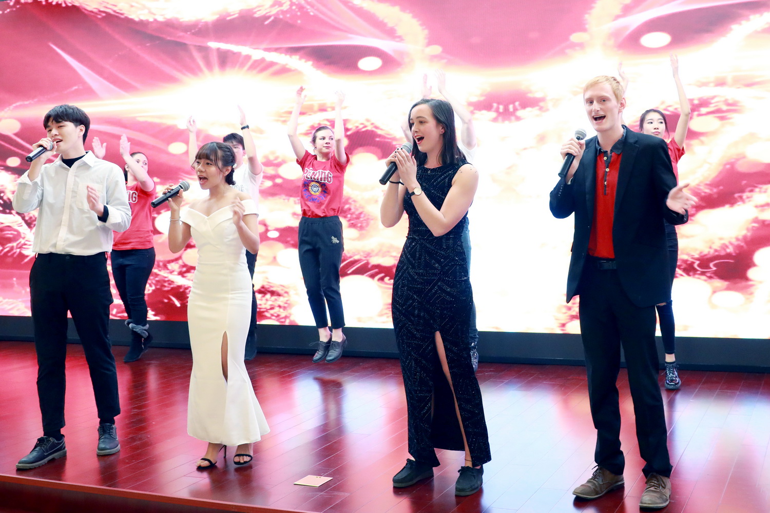 当晚,留学生献上了精彩的表演。作为开场节目,各国留学生一起表演了《相亲相爱》,“天下相亲与相爱”,正是各国留学生在燕园一起学习、共同成长的最好表达。本届十佳歌手大赛的冠军扎布哈(Lkhaasuren Bayarjavkhlan)深情献唱《乌兰巴托的夜》,悠扬的旋律仿佛将现场观众带入了美丽大草原。马来西亚同学的《贝加尔湖畔》,演绎了浓郁的俄罗斯风情。相声《说学逗唱》中,留学生将快板、扯铃、唱歌、非洲舞和法国现代舞完美结合,赢得了现场观众的阵阵掌声。来自蒙古的双胞胎姐妹演唱了《天路》,让观众再一次领略了经典的魅力。临近尾声,Double Cheese的《歌曲串烧》一次次将气氛推向高潮。