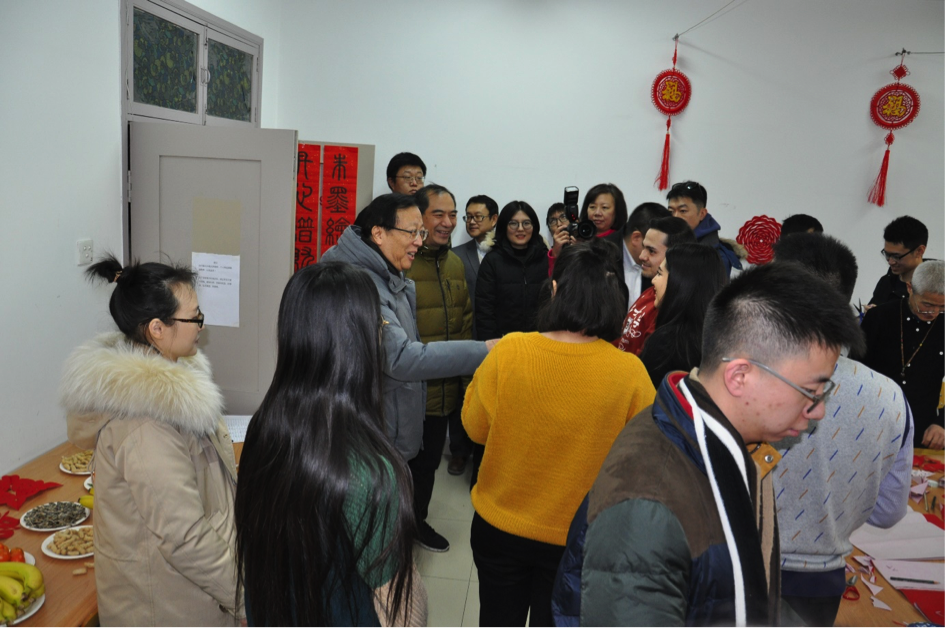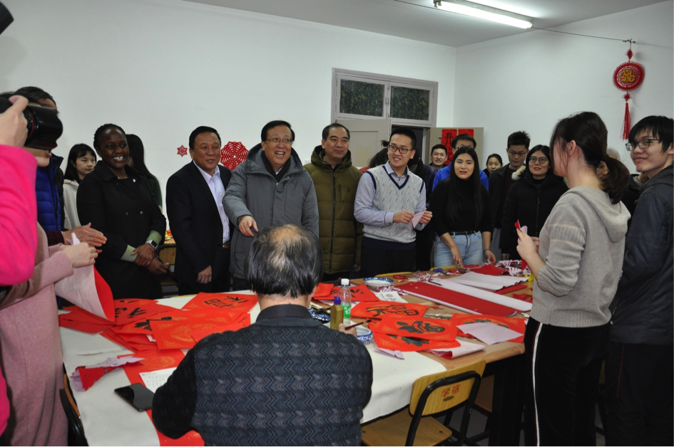 下午2点多,校领导一行来到39楼宿舍,看望正在参加联欢活动的学生。郝平校长向在场的师生拜年,他表示,你们在北大过年,学校非常关心,为大家安排了相关活动,希望你们开开心心过好年,多和家里通电话,向家里介绍这边的情况,把学校的问候带给家人。他还亲切询问了几位留学生的国籍,了解他们在这里的学习和生活,并和他们交流他们家乡的情况,祝他们在北大学习和生活顺利。他指出,中外学生融合很重要,大家一起联欢,效果非常好。