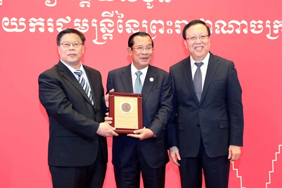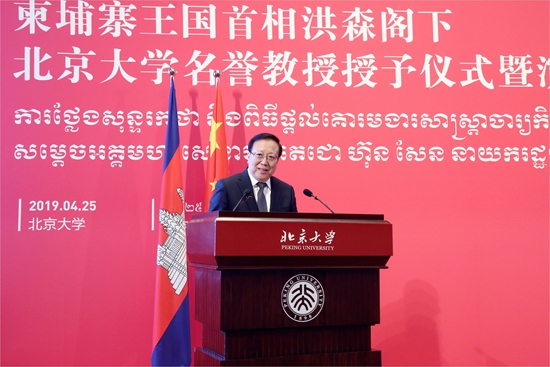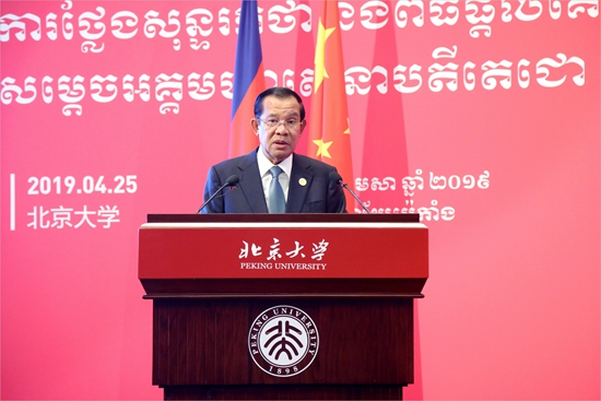 2019年4月25日下午,柬埔寨王国首相洪森携访华代表团访问北京大学,在英杰交流中心接受了北京大学授予的名誉教授称号,并发表演讲。