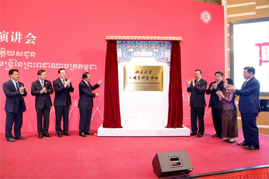 演讲结束后,田学军与洪森共同为北京大学柬埔寨研究中心揭牌。邱水平、郝平、王文天、柬埔寨驻华大使凯•西索达、柬埔寨皇家翰林院院长宋独、SK集团顾问金在烈共同见证了中心成立。