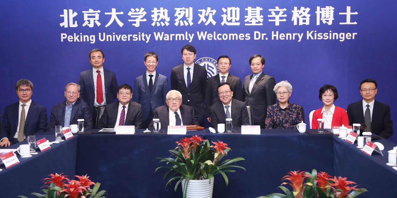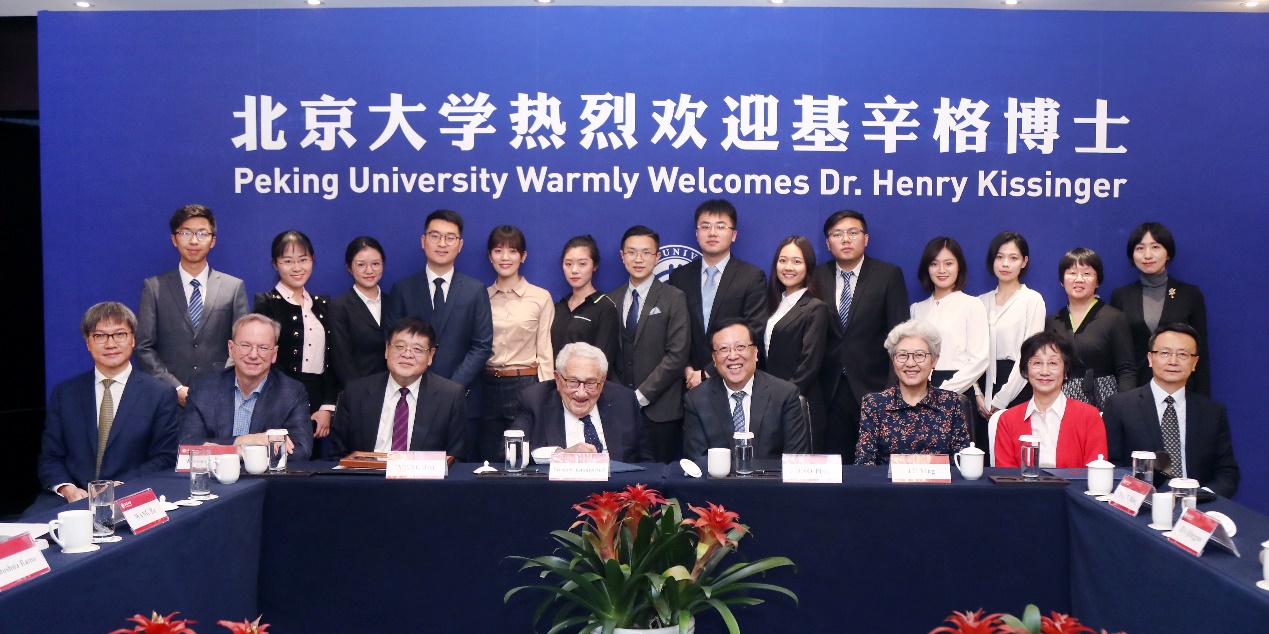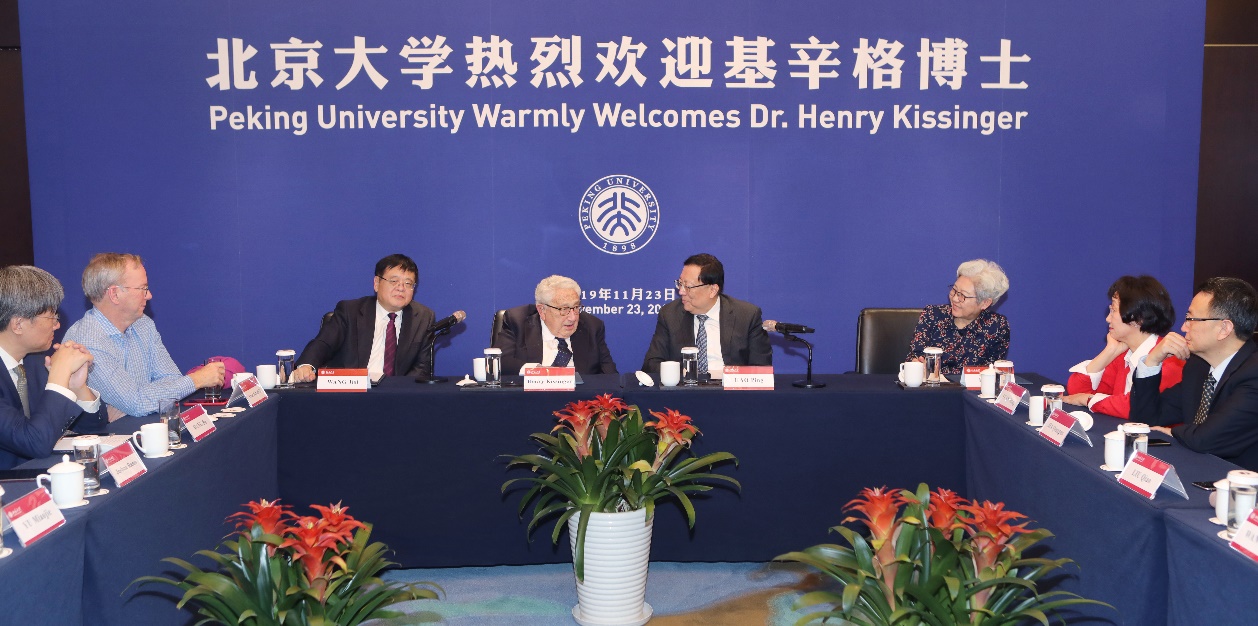 2019年11月23日,美国前国务卿基辛格(Henry Kissinger)博士访问北京大学并与师生座谈,谷歌前董事长埃里克·施密特(Eric Schmidt)陪同来访。北京大学校长郝平、副校长王博、副校长兼教务长龚旗煌参加座谈。清华大学战略与安全研究中心主任、外交部前副部长傅莹受邀参加座谈。座谈会由北京大学国际战略研究院院长王缉思主持。