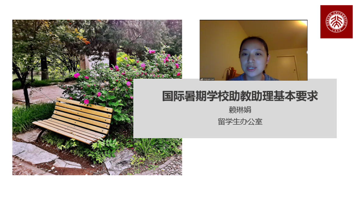 国际合作部专家办公室副主任、留学生办公室代表赖琳娟介绍新成立的国际暑期学院以及对助教助理的基本要求。北大国际暑期学院基于北大多年来国际暑期学校项目运行基础,以“你房间里的中国行”为主题,面向全球和北大学生开放。项目对于应征助教及助理均设定了较高要求,并提供相应的培训和支持。