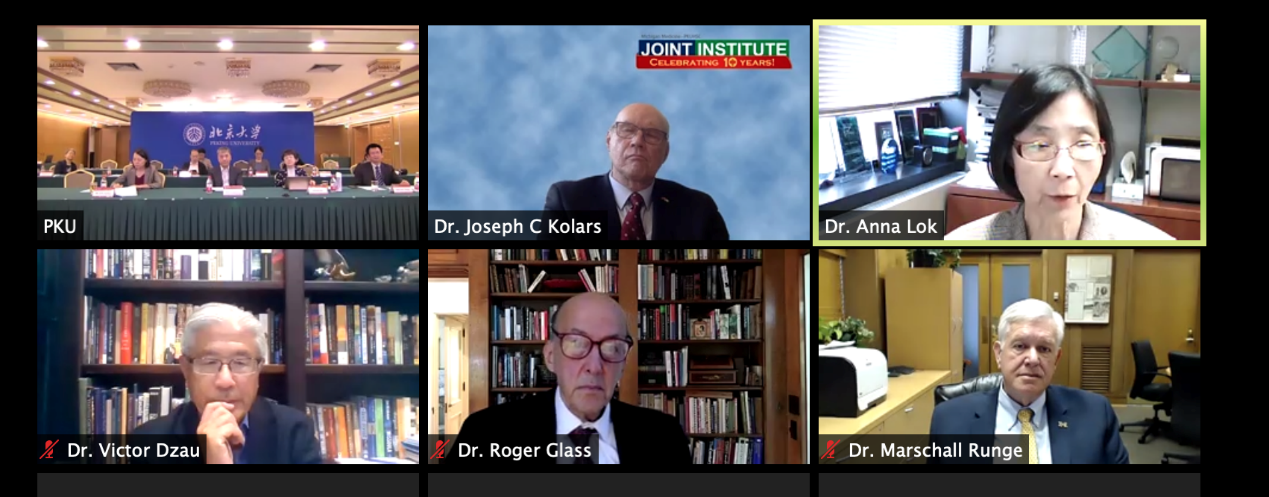 2020年9月24日晚,北京大学医学部-密西根大学医学院转化医学与临床研究联合研究所(“联合研究所”)十周年线上庆典活动在线举行。北京大学校长郝平,北京大学常务副校长、医学部主任詹启敏,北京大学医学部常务副主任、北京大学第三医院院长乔杰,北京大学医学部副主任段丽萍,密西根大学校长马克·施莱赛尔(Mark Schlissel),美国国家医学科学院院长维克多·曹(Victor Dzau),美国国立卫生研究院Fogarty国际中心主任罗杰·格拉斯(Roger Glass),密西根大学常务副校长、医学院院长马歇尔·龙格(Marschall Runge),美国密西根大学医学院临床研究副院长安娜·洛克(Anna Lok)等出席活动。北京大学医学部副主任张宁、密西根大学医学院资深副院长约瑟夫·考拉斯(Joseph Kolars)主持庆典活动。