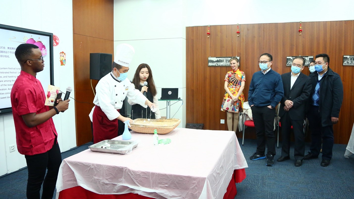 两位主持人——来自拉脱维亚的安泽(Anzelika Smirnova)和来自喀麦隆的门杜(Joseph Olivier Mendoo)通过生动的文字与视频短片为大家直观呈现了元宵节的来历和传统习俗。活动随即进入大家最为期待的南北方“做汤圆”VS“滚元宵”体验环节。