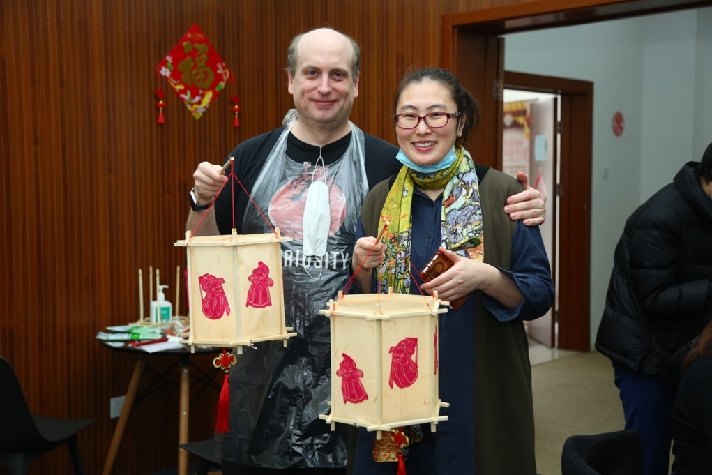 做灯笼、赏花灯是元宵节最喜庆热闹的文化活动。自古以来每逢正月十五,街头巷尾红灯高挂,承载着家家户户的新年愿景和祝福。今天,古老的榫卯结构在外国留学生及专家的手中变换着样式,交流着多彩文化,碰撞出新的火花。各种肤色的双手纷纷拿起竹条,架起花灯框架,小心翼翼地将传统剪纸、年画贴在灯笼纸上,一个一个用心编制的花灯逐步成型,映衬着老师同学们的灿烂笑脸,现场氛围热烈欢愉,亲如一家。来自美国的Graham教授与其来自韩国的妻子Aera“夫妻双双齐上阵”,两盏古色古香的花灯随即出炉,尽应元宵团圆之意。