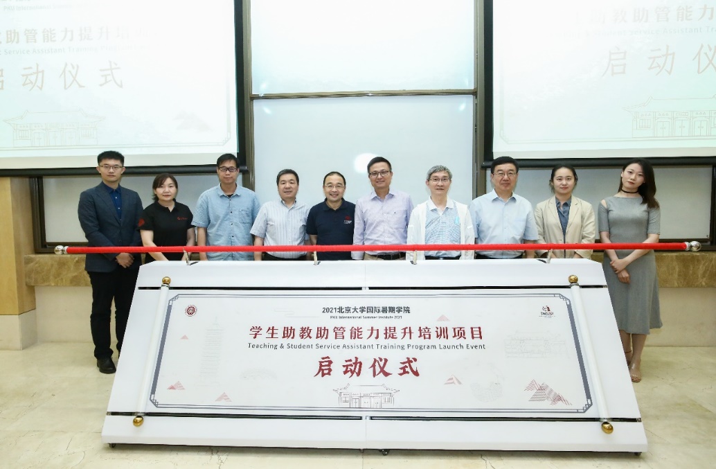 国际合作部、教发中心、教务部、对外汉语教育学院、校团委、工学院、芝加哥大学北京中心代表、国际暑期学院授课教师及助教代表一起上台,共同推杆启动“2021年北京大学国际暑期学院学生助教助管能力提升培训项目”。