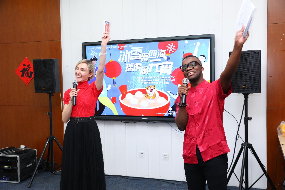 冰雪盛会广迎八方来客,上元灯火共聚四海亲朋。中国红遇上冰雪白,节上添节,祝福满溢。2月15日,2022年北京大学留学生及外国专家“庆元宵”活动在中关新园举行。本次活动由国际合作部与会议中心共同举办,共襄壬寅虎年冬奥盛世,同庆四海师生元宵团圆。