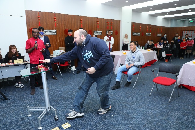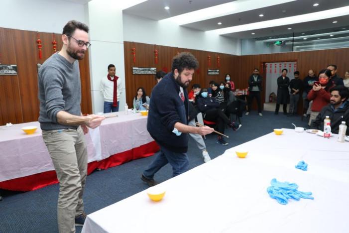 精心设计的游戏环节将活动氛围推向高潮。游戏中,无论肤色语言,每一位参与者都是筷子高手,纤长的竹筷夹着光滑的弹珠“汤圆”,一来一回之间,大家尽兴游玩,开怀大笑。跳台滑雪、短道速滑、冰球……一项项由老北京“兔儿爷”演绎的冬奥项目在大家的抢答中脱口而出,在场师生拍手称赞,仿佛置身冰雪奥运现场的鼎沸之中。