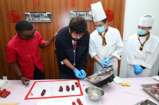 蘸一串“冰墩墩”,酸甜可口。冰糖葫芦,也叫“酸蘸儿”,北京人迎新春逛庙会时都会吃上一串,是逢年过节必不可少的甜品。糖水熬微黄,大泡变小泡,师傅利落起锅,串好的山楂在糖水中打个转,动作行云流水,一串串“冰墩墩”已经在糯米纸上晾凉待人享用。体验制作冰糖葫芦的台前,师生们纷纷摩拳擦掌、跃跃欲试。