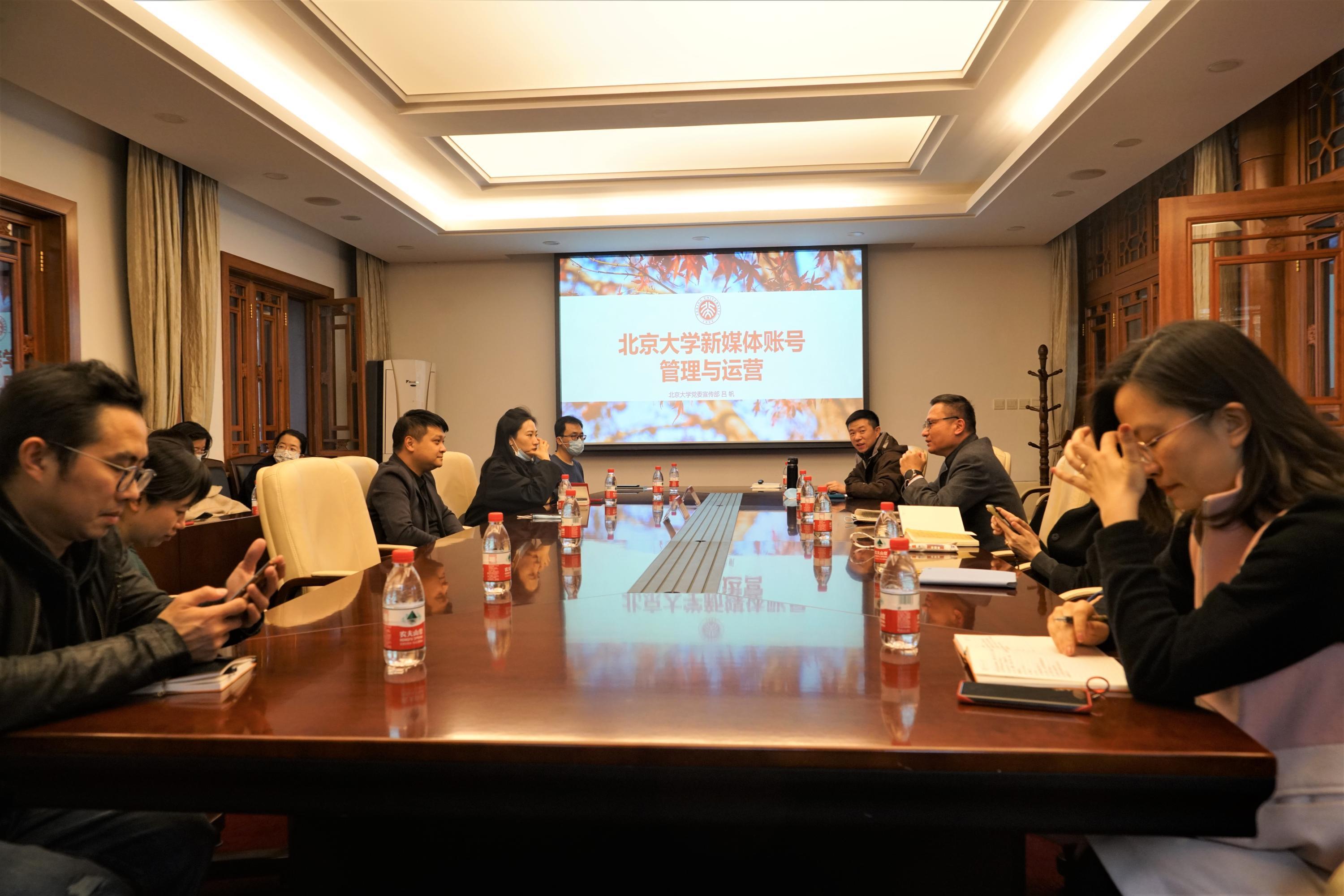吕帆介绍了党的宣传思想和学校的有关规定,并重点解读了《北京大学新媒体账号管理办法》的相关内容。之后,他详细介绍了北京大学全球传播融媒体矩阵,包括两微、音视频号、政务号、国际新媒体号四类账号的有关情况。结合新媒体传播的优秀案例,吕帆建议加强校级和二级单位的联动,联合开展专题策划,形成传播聚合力。在交流互动环节,参会人员与吕帆、杨萌两位老师围绕规范信息发布流程、加强选题策划、统筹账号联动等进行了热烈的讨论。