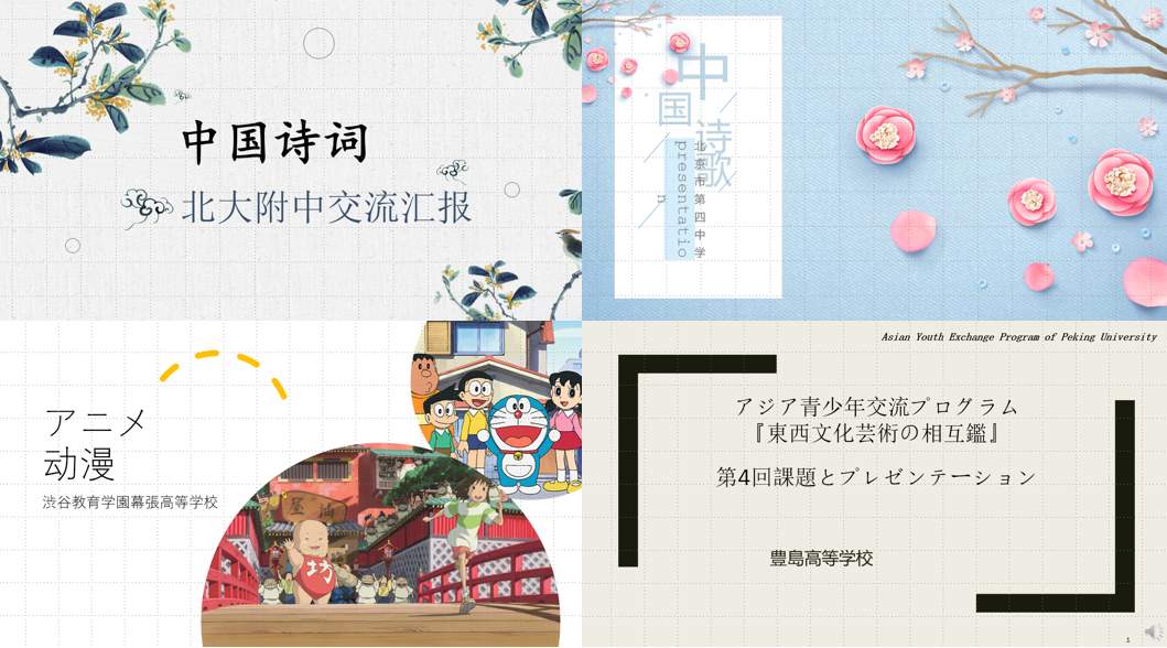 来自北大附中、北京四中、涩谷幕张高中和东京都立丰岛高中的同学们,围绕心目中最具代表性的本国文化进行了小组报告,分别介绍了诗词、诗歌、动漫、茶道等文化形式及相应的国际推广设想。