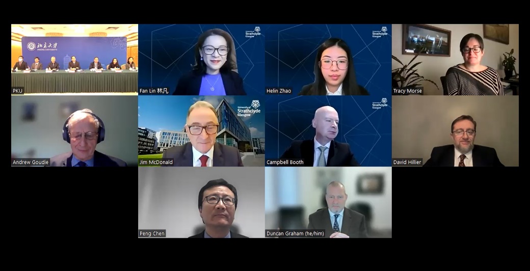 龚旗煌表示,很高兴与思克莱德大学的同事们在线交流,探讨双方合作。他指出,吉姆爵士是北京大学的名誉教授,长期积极推动与北大及中国的科学研究合作。北京大学高度重视全球气候变化、可持续发展等新兴领域的研究,致力于推动绿色可持续发展。两校在上述领域的合作达成了诸多共识并取得了一系列合作成果。