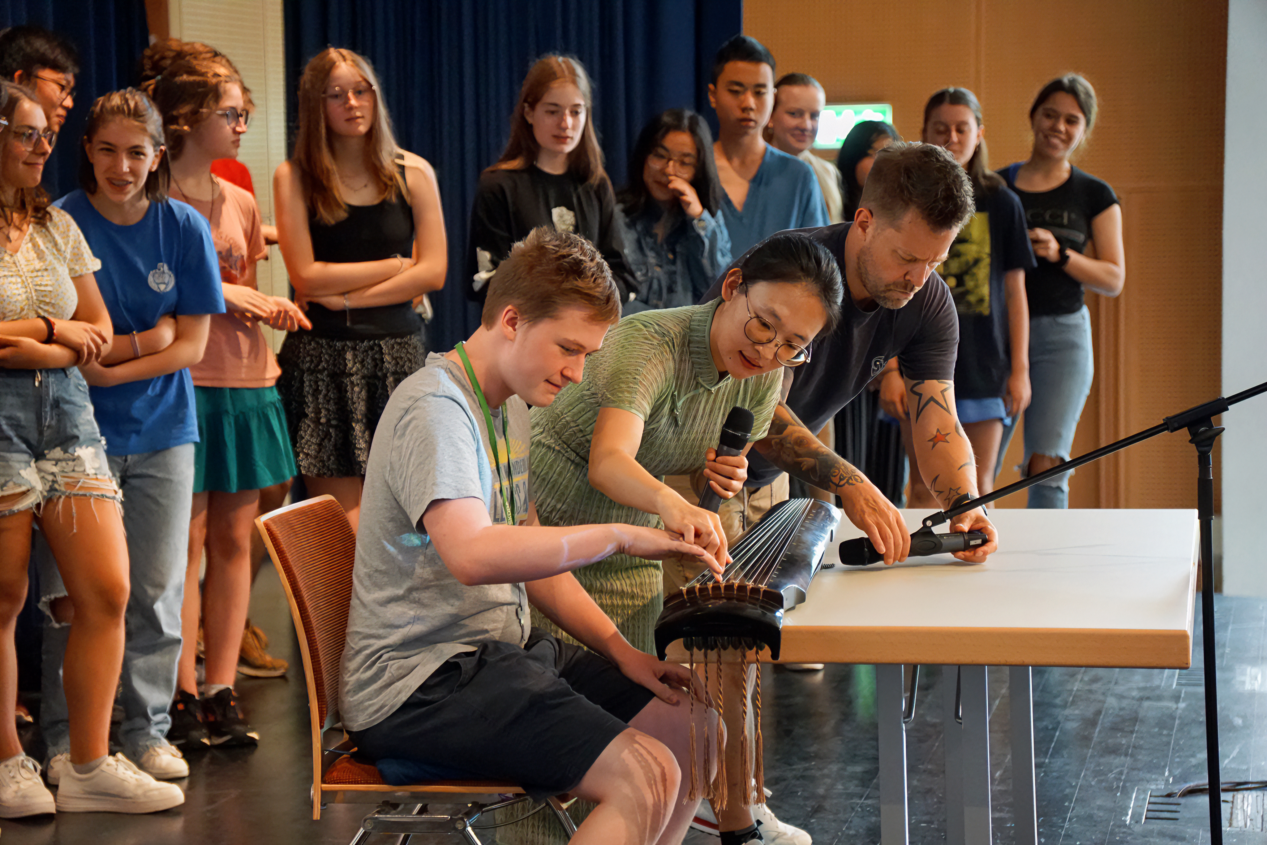 当地时间6月21日、6月22日,北大代表团先后走进卢森堡两所最好的中学——艾默生中学、雅典娜中学开展工作坊交流,在面对面的表演、讲解和手把手的示范、体验中,更多卢森堡青少年有机会走近中国文化、了解中国文化。现场,北大代表团带来了《酒狂》《流水》《寒夜》《天净沙·秋思》等古琴曲目及《牡丹亭》的经典唱段,演出深深吸引了当地师生,现场掌声不断。演出后的交流环节气氛也十分活跃,同学们纷纷举手提问,并主动上台参与互动体验,表现出对中国传统文化的浓厚兴趣。