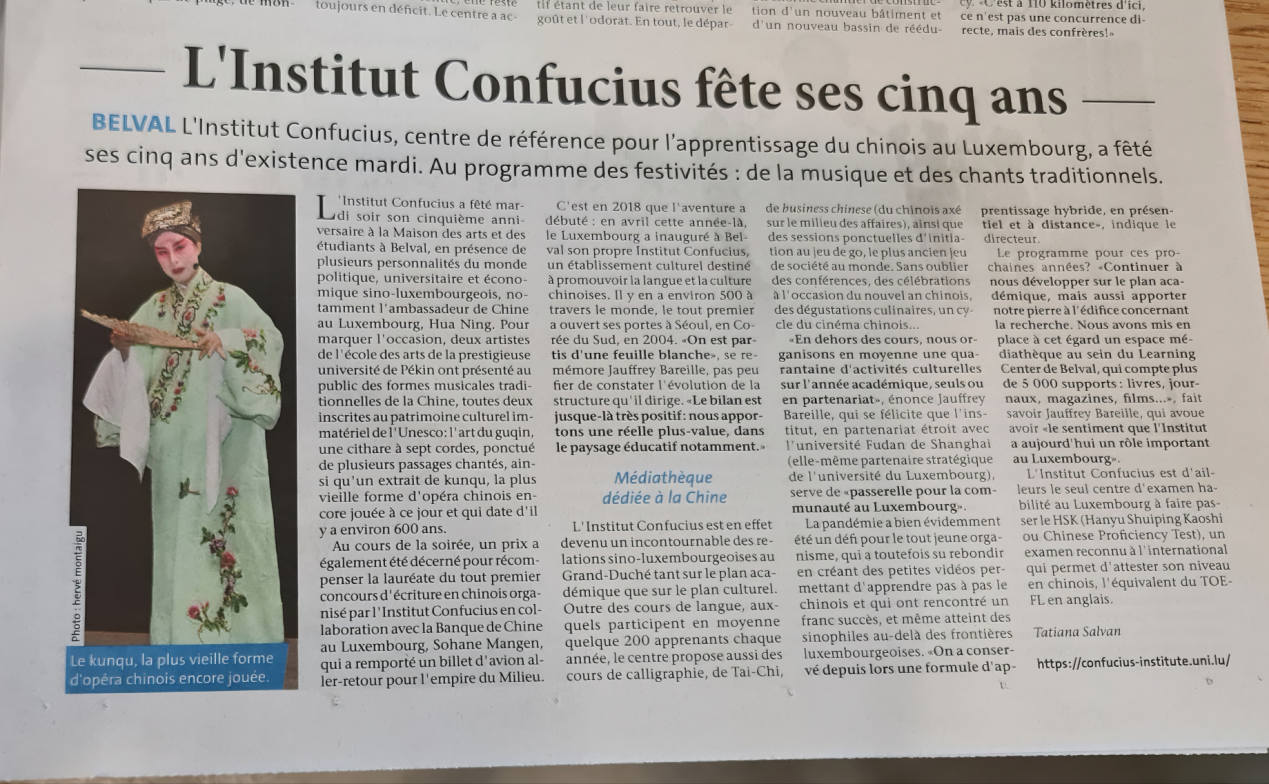 陈均与北大代表团的师生一起为中外嘉宾带来了古琴、弦歌与昆曲专场表演。在空灵悠扬的琴声与婉转迷人的唱腔中,现场观众仿佛走进了一幅高山流水、淡墨淋漓的中国画。北大师生的表演获得了华宁的高度肯定,也吸引了卢森堡当地媒体的关注与报道。