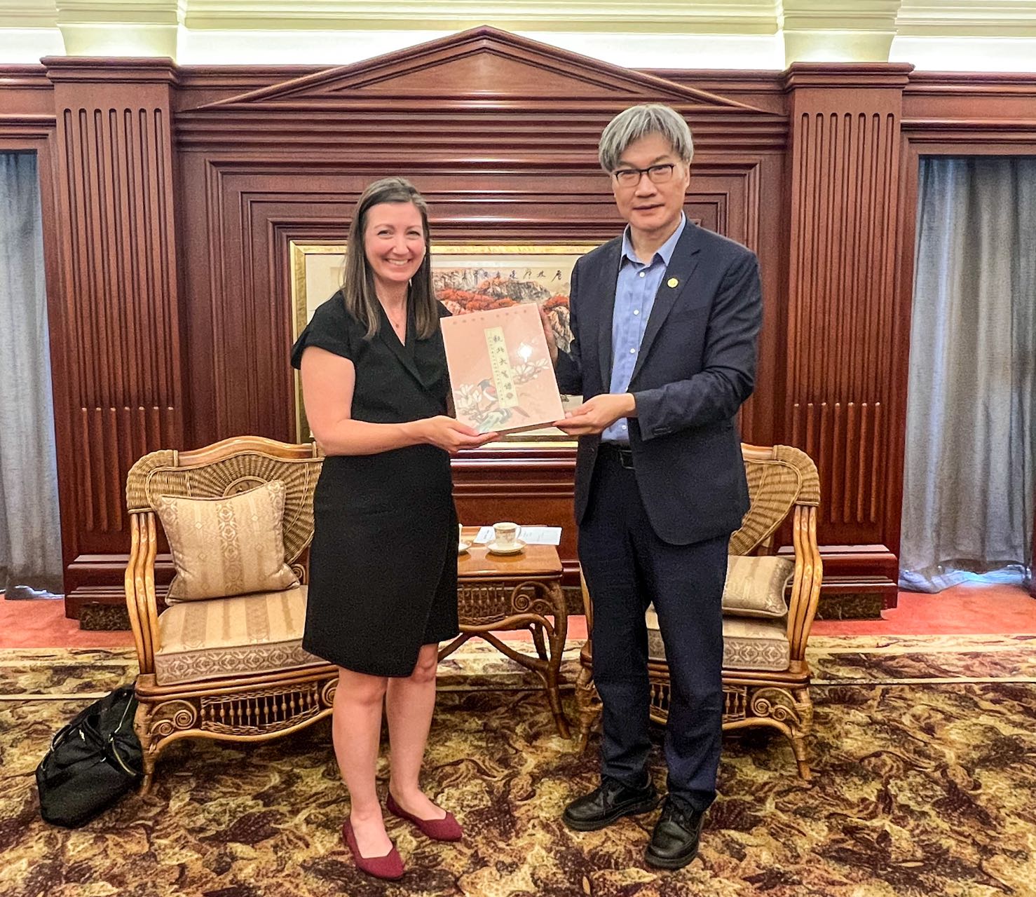 2023年7月10日,美国芝加哥大学助理副校长凯蒂·赫林亚克(KatieHrinyak)、芝加哥大学北京中心主任戈泽宁一行到访北京大学。北京大学副校长、教务长王博在英杰交流中心会见。双方就两校人才培养、科研合作、学术交流等内容交换意见。北京大学芝加哥中心学术主任、光华管理学院副院长张影教授一同参加会见。