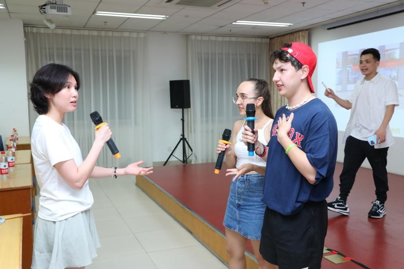 “真假北大人”游戏点燃了整场活动的气氛。游戏由留学生主持人带领,学生自告奋勇上台,分组配合,两人背对屏幕,另一位同学则负责描述图片的细节,背对屏幕的同学需要根据另一位同学的描述,猜出图片中的地点或事物,鸡腿饭、未名湖,题面则都是经典北大元素。通过游戏来测试新生对北大的熟悉情况,以增加趣味性和互动性。获胜小组一分钟之内答出六题,喜获精美奖品。