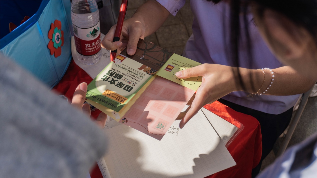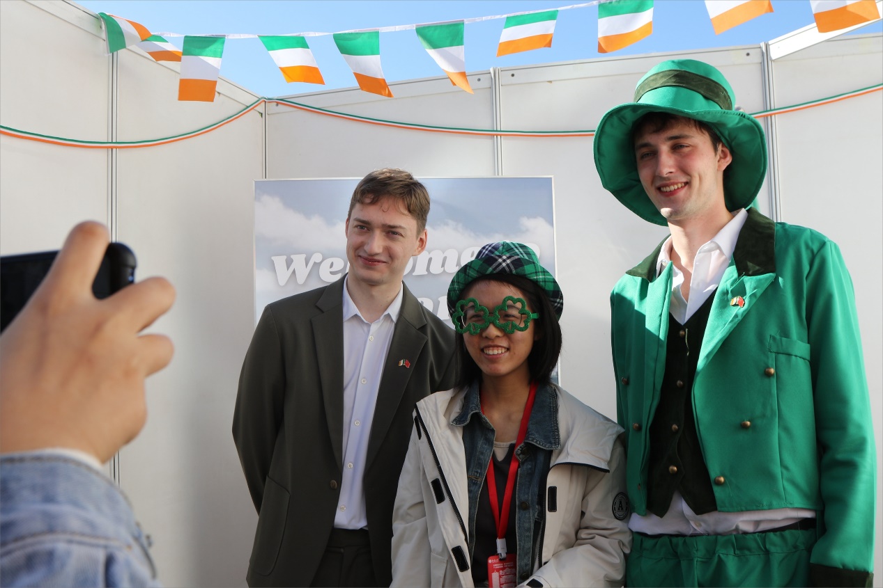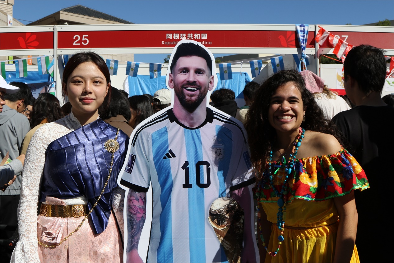 阿根廷展位前,身着特色服饰的学生与梅西立牌合影