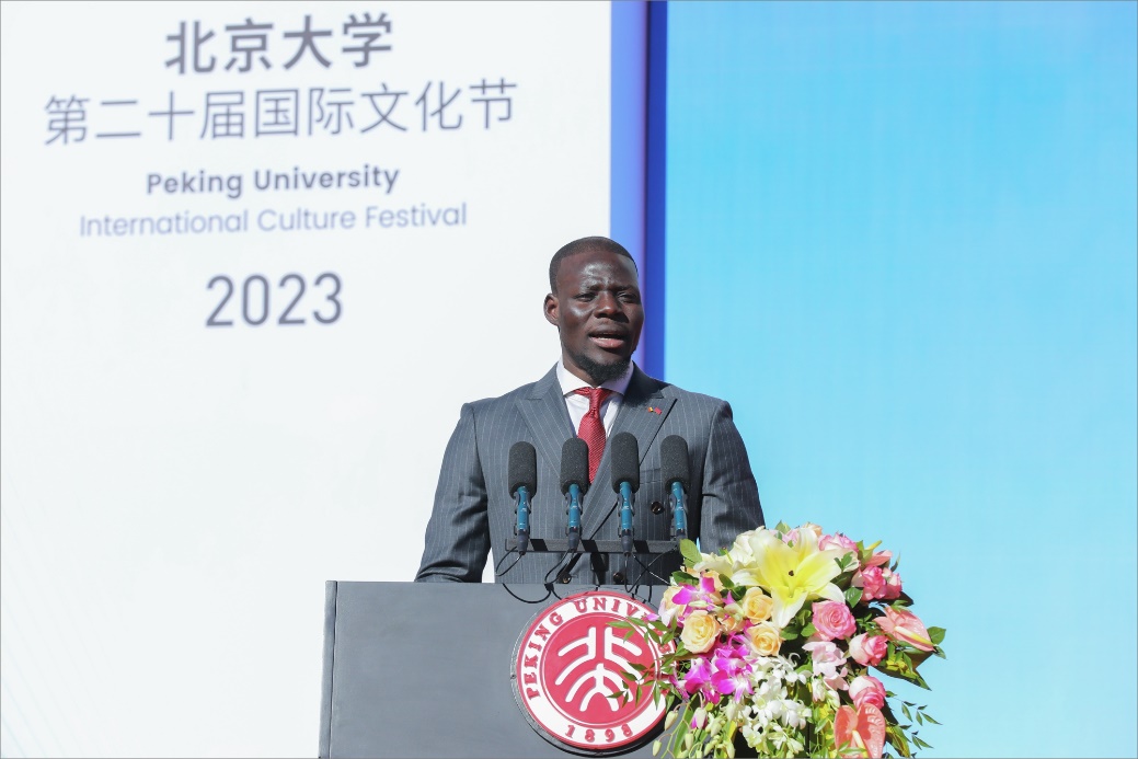 北大国际关系学院乍得籍博士研究生托马作为留学生代表发言。他表示,留学北大、留学中国让他获得更加多元和国际化的视野,体会到多元文化之美。他认为,北京大学国际文化节创立20年以来,为师生及社会各界的朋友们提供了相互学习、彼此交流的平台,承载着四海一家、天下大同的美好梦想,汇聚起无数中外青年立己达人、和衷共济的磅礴力量。