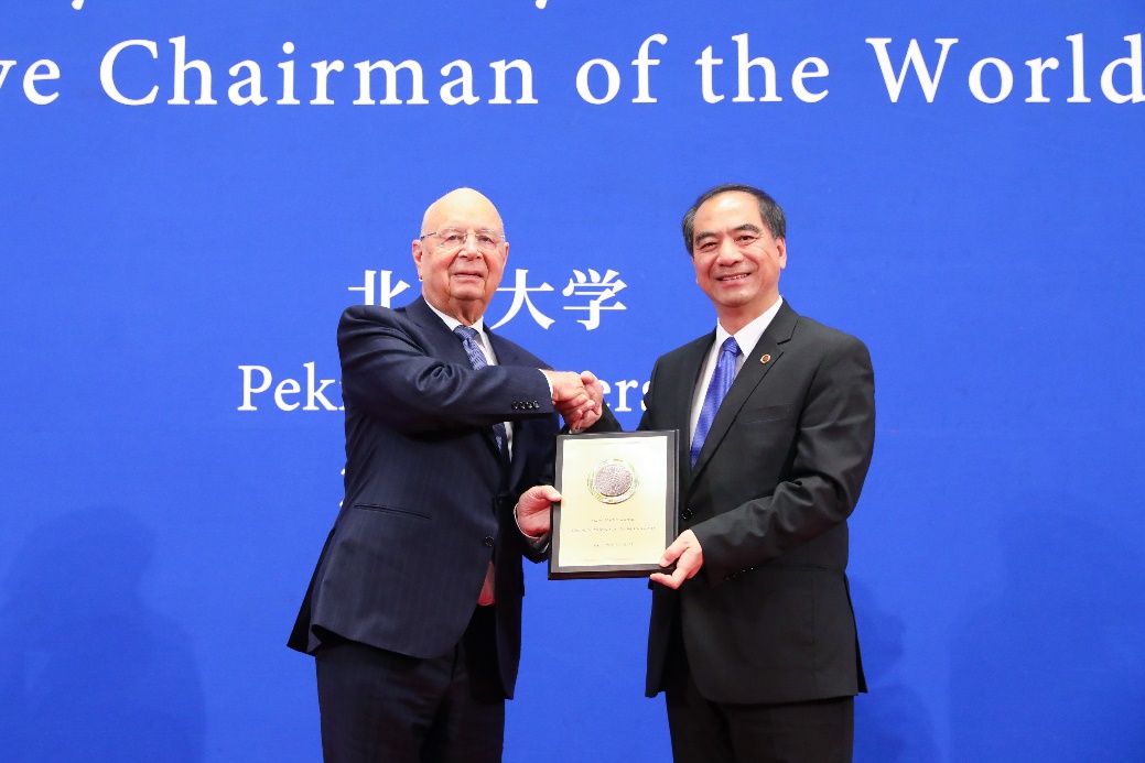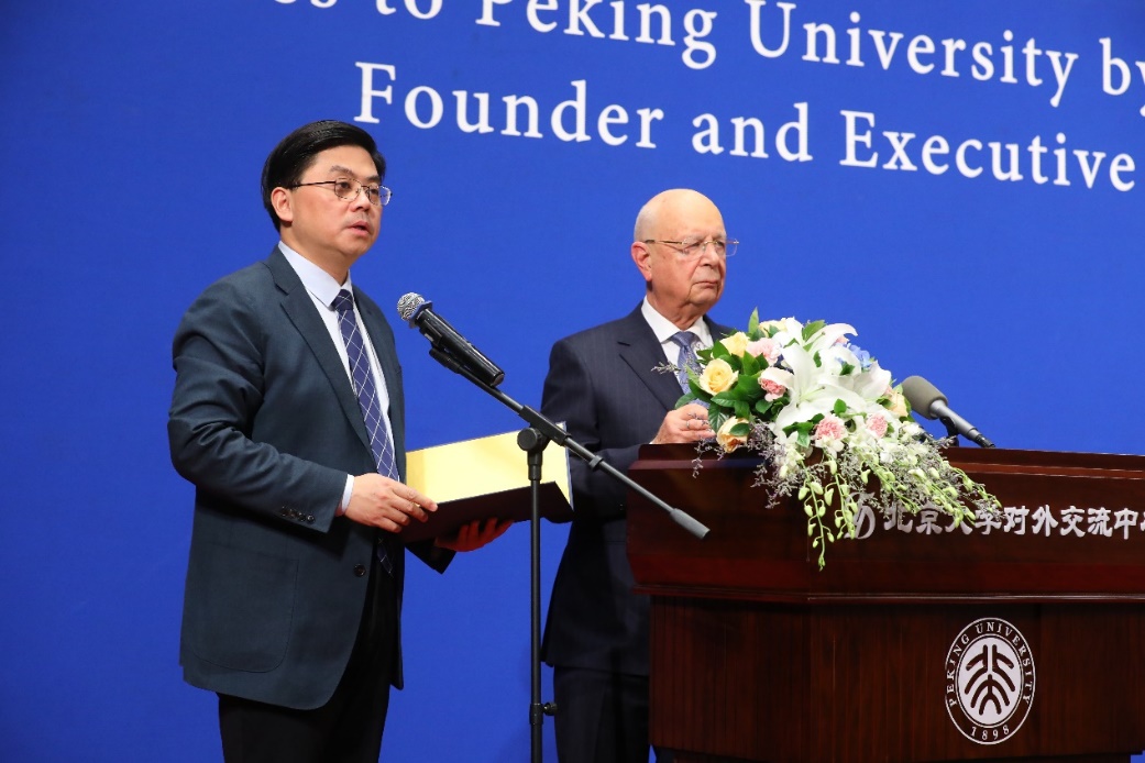 2023年11月21日,世界经济论坛创始人兼执行主席克劳斯·施瓦布(Klaus Schwab)一行访问北京大学,接受北京大学名誉教授称号并发表演讲。北京大学党委书记、校务委员会主任郝平会见来宾,北京大学校长龚旗煌出席名誉教授授予仪式。北京大学副校长兼总务长董志勇参加活动,北京大学副校长方方主持仪式。