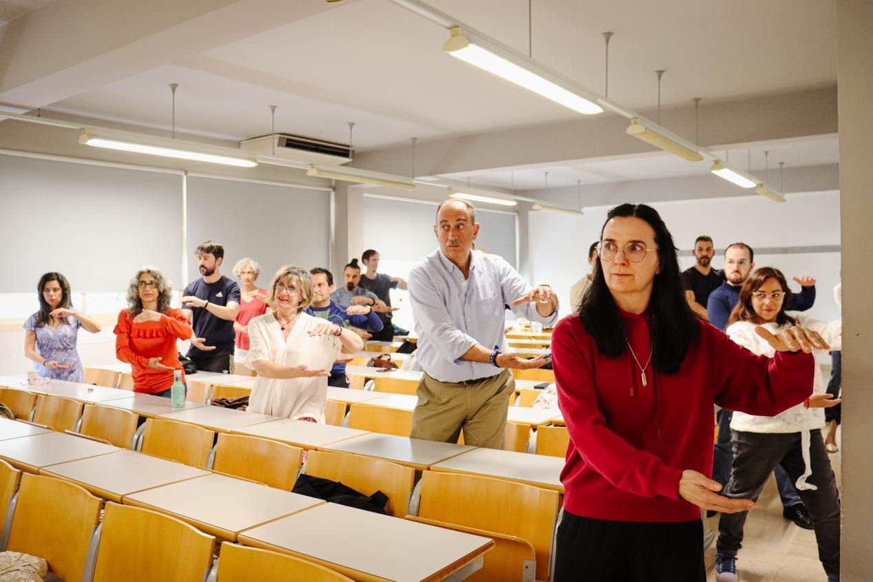 次日,4月26日,巡讲来到格拉纳达大学,王东敏为当地太极拳爱好者带去了一场精彩的太极文化体验活动。此次活动不仅包括了内容翔实的文化讲座、面对面的太极教授,在互动环节,王东敏还结合生动的数据与案例,对太极拳的健康益处和文化意义进行了深入解答。她指出,太极拳属于中低强度的有氧运动,是追求动态平衡的“中和”和“和谐”的全身心的整体运动。在场观众纷纷表示受益匪浅,期待有更多这样的交流活动。