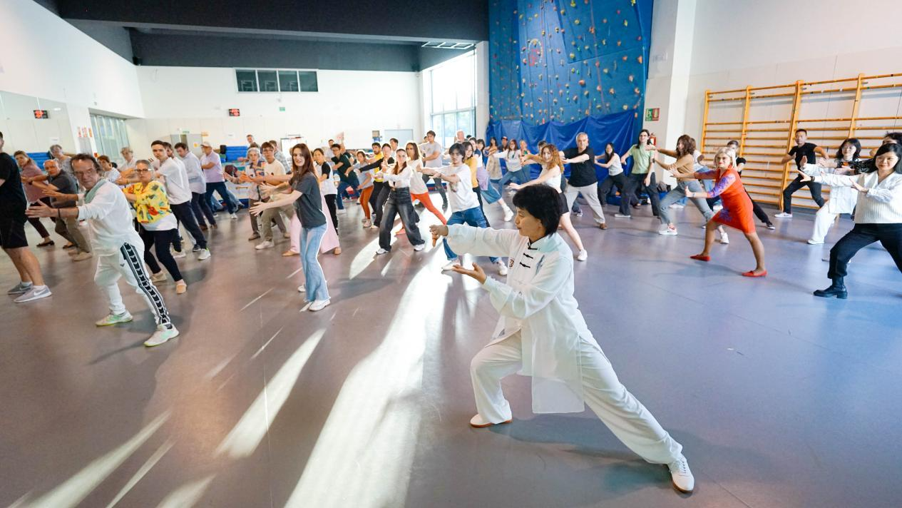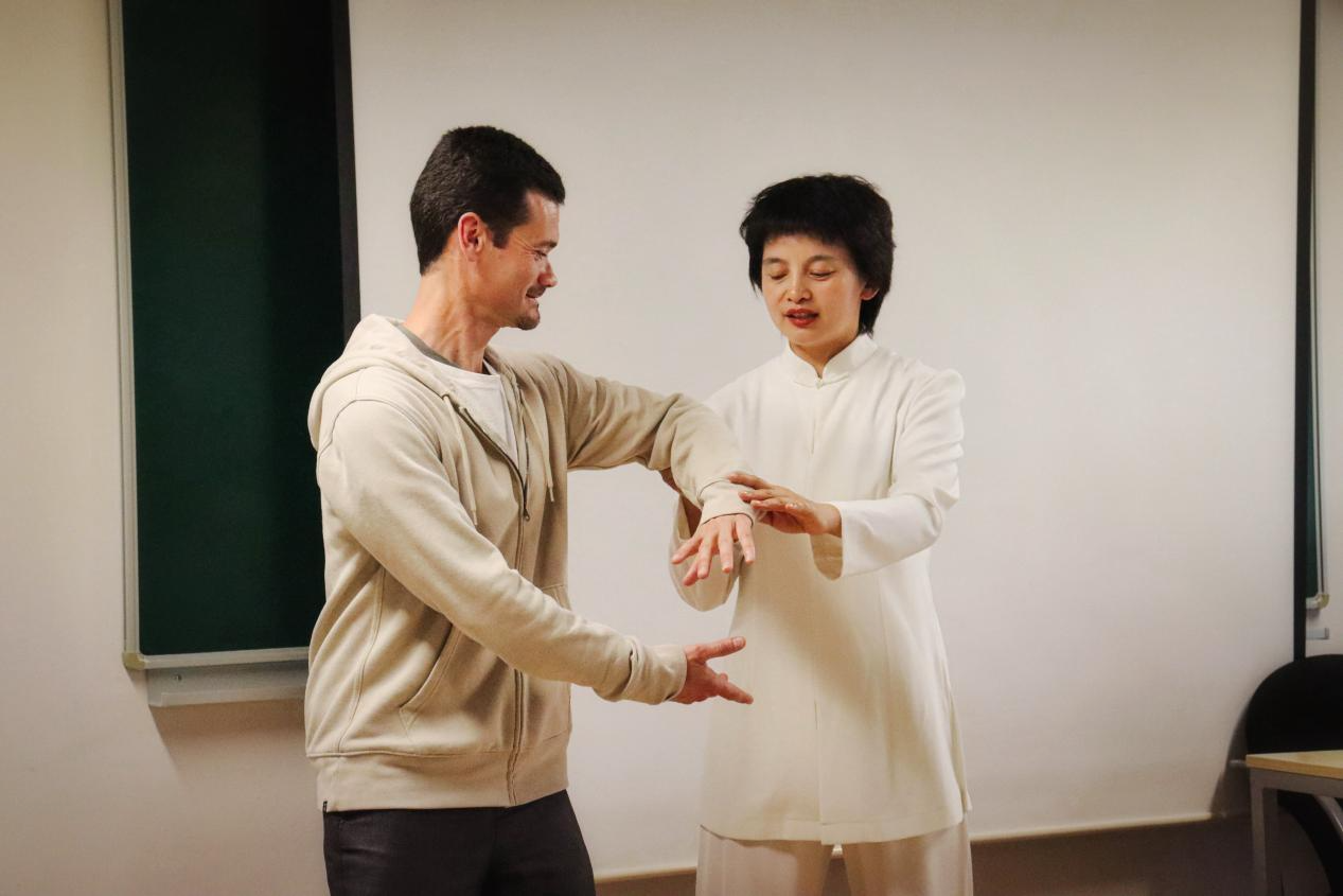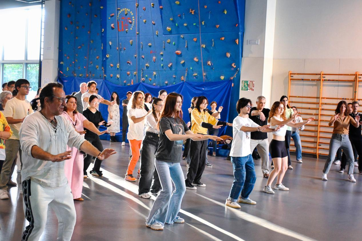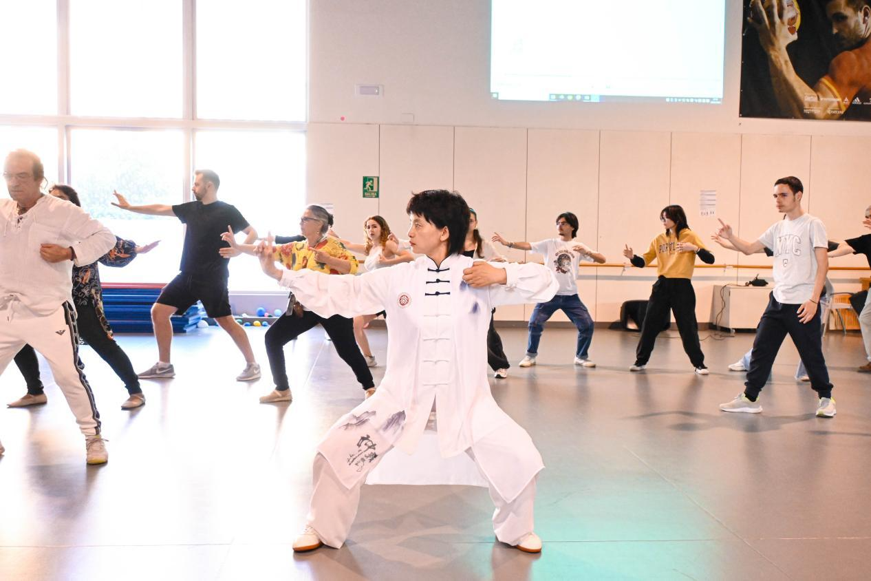 在互动环节中,王东敏带领大家练习太极拳与热门养生运动“八段锦”。现场气氛热烈,众多来自塞维利亚大学的学生表示,尽管他们此前听说过太极拳,但这是第一次真正体验、感受和练习这项奇妙的东方运动。安德莉亚(Andrea)开心地分享道:“太极拳中的许多动作都是循环和缓慢的,但在需要自我防卫的时刻,它也非常实用。我新发现了一项喜欢的运动,将来我会继续练习太极!”卡门(Carmen)则感受到太极拳作为“运动中的冥想”的独特魅力,她说:“太极拳与其他运动的不同之处在于它更加舒缓,练习时能感受到一种宁静。”而在哈维尔(Javier)看来,“太极是一项非常有趣的运动,需要全神贯注地投入。一旦你掌握了哪怕一点点,就能感受到它带来的身心放松和极大益处。”
