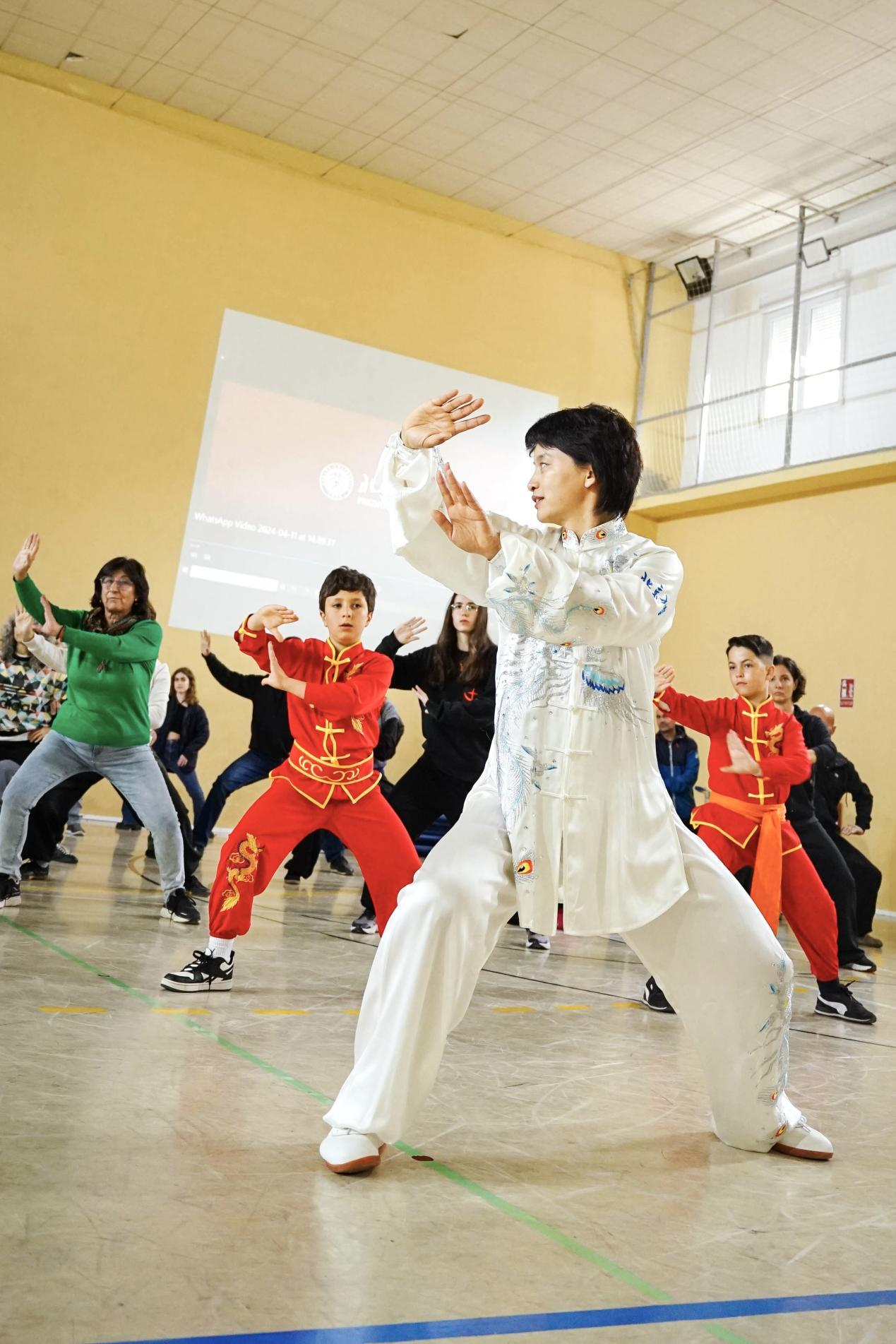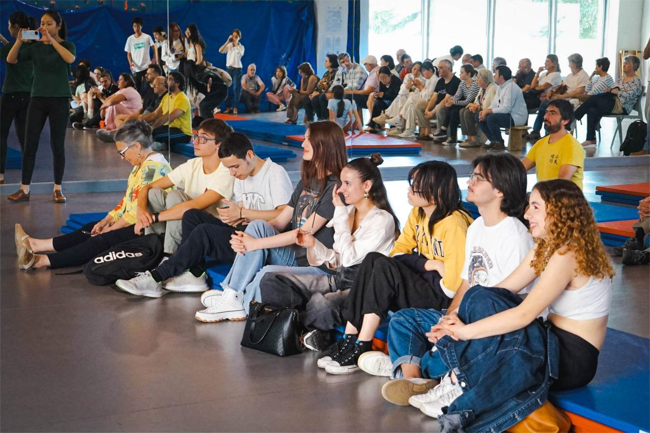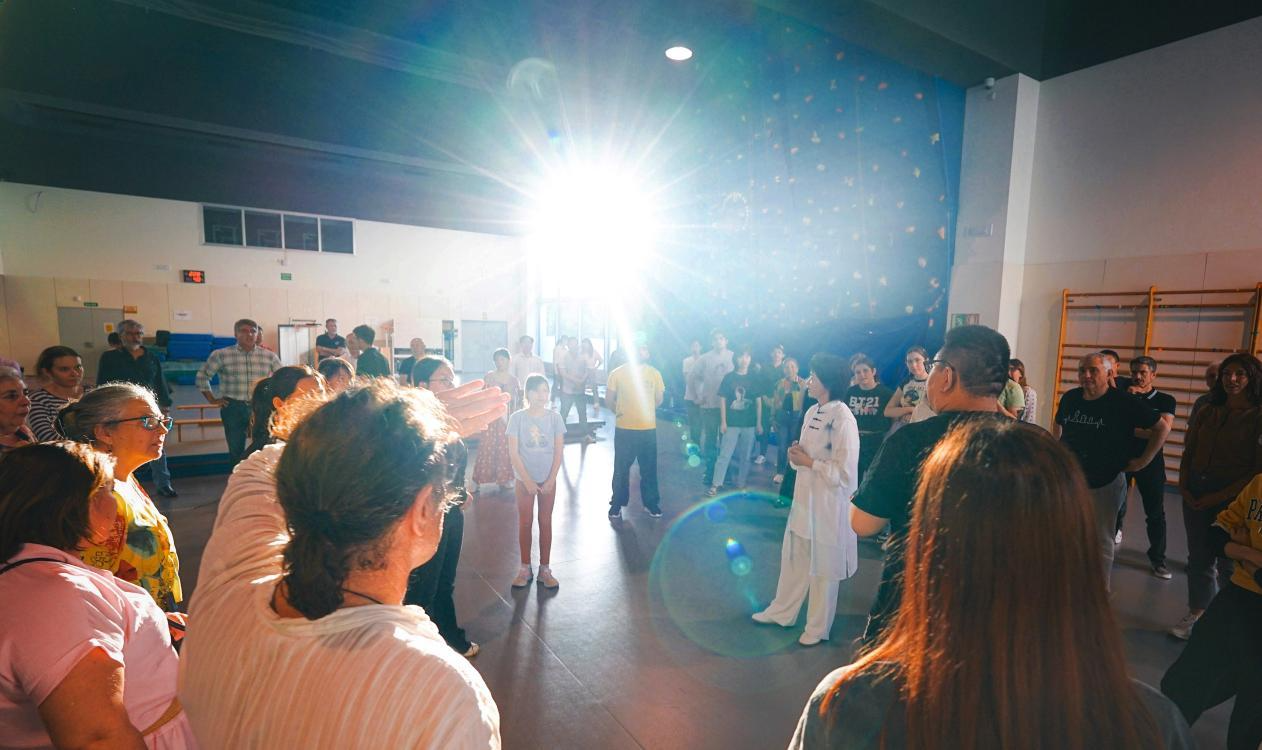 茶歇环节,格拉纳达大学孔子学院的老师们进行了传统茶艺表演,清香氤氲,现场观众细细观摩、品茗论道,领略中国文化的独特魅力。茶歇过后,全场观众一同跟随王东敏习练太极拳,从七八岁的孩童,到六七十岁的老人,每个人都专注而投入,认真学习“刚柔疾缓、内外一统”的传统拳理。12岁的小龙(Alejandro)受习武父亲影响,十分热爱中国文化,他兴奋地分享:“功夫和太极很酷——不仅仅是身体的锻炼,也会使内心变得更强大。”