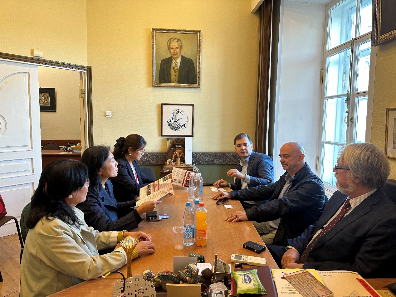 9月19日,代表团一行访问圣彼得堡国立大学东方系,会见东方系常务副主任阿列克谢·罗季奥诺夫(Alexey Rodionov)、中国语文学教研室主任索嘉威(Alexander Storozhuk)等学者。阿列克谢·罗季奥诺夫表示,东方系与北京大学相关院系有着密切的学术合作,双方合作出版和编译的众多书籍对推广两国文化交流和加深互信了解作出了积极贡献。尤其是近年来,学术交流日益密切,圣彼得堡国立大学开设中国特色课程的学科日渐增多。宁琦表示,希望双方继续加强人文交流,支持和鼓励俄罗斯汉学家及对中国文化感兴趣的学者学生访问北大,促进区域国别领域的联合科研。