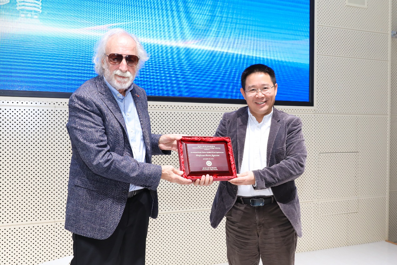 彭良友为阿戈斯蒂尼颁发“北京大学百年物理讲坛”纪念牌