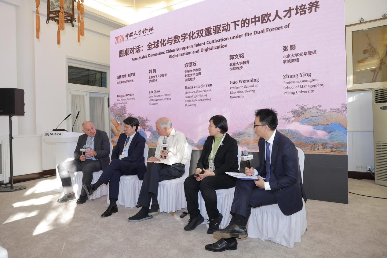 分论坛中,2018年诺贝尔物理学奖得主、北京大学讲席教授杰哈·穆鲁作特邀报告,重点探讨了科技创新在教育领域的巨大影响力,分析科技进步如何推动教育方法革新。北京大学人工智能研究院院长朱松纯教授作主旨报告,聚焦教育智能化的前沿探索、分享了AI驱动的学习模式与创新实践。随后,思克莱德大学副校长道格拉斯·布罗迪,北京大学光华管理学院院长刘俏,剑桥大学教授、北京大学访问讲席教授方德万(Hans van de Ven),北京大学教育学院长聘副教授郭文茗,围绕“全球化与数字化双重驱动下的中欧人才培养”展开讨论、观点交锋精彩纷呈。分论坛由北京大学光华管理学院教授张影主持。