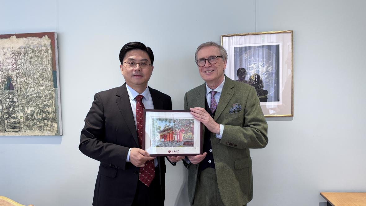 在克莱尔堂,方方会见了院长艾伦·肖特(Alan Short)。肖特介绍了学院的办学理念,强调其作为剑桥大学跨学科合作与学术交流平台的重要作用,并期待与北京大学通过互派学者和联合研究深化合作。方方高度评价克莱尔堂的国际化与多学科研究环境,并建议未来双方通过联办讲座、学术研讨会和师生交流等形式,共建高水平学术合作网络,推动国际学术发展。