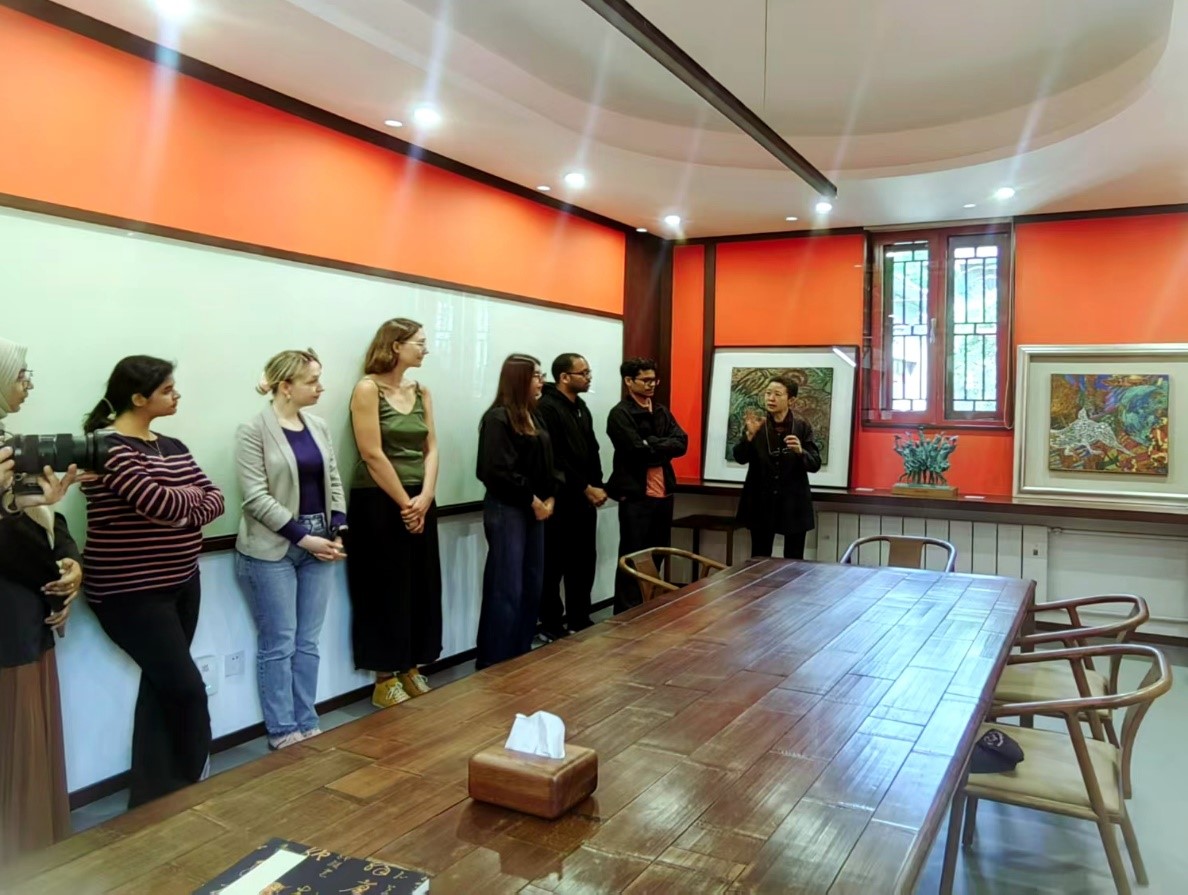 在由中国女画家协会、北京大学艺术学院及会议中心联合主办的"万物生长——中国女画家小幅精品邀请展"现场,外籍教师们在艺术家们的引领下开启美学探索之旅。中国女画家协会副会长安佳、王一帆及常务理事徐冬青三位专家,以专业视角解析了21位当代女性艺术家创作的60幅精品。从水墨晕染到工笔精微,从写意传神到当代创新,画作既展现女性艺术家对生命力的深刻诠释,亦彰显出坚韧、包容与温暖的时代特质。