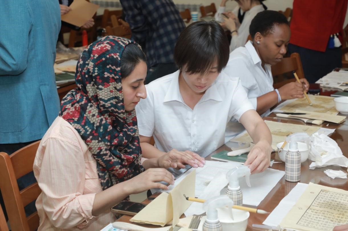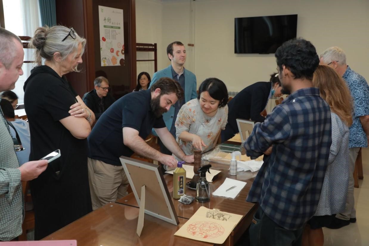 在互动体验环节,外专们分组参与了中国书法、古籍修复和雕版印刷等传统文化实践项目。许多人第一次执毛笔书写汉字,亲手操作雕版印刷,或在修复老师的指导下体验古籍修复的精湛技艺。现场气氛热烈,互动频繁。通过亲手实践,大家进一步感受到中华传统技艺的独特魅力与文化厚度。