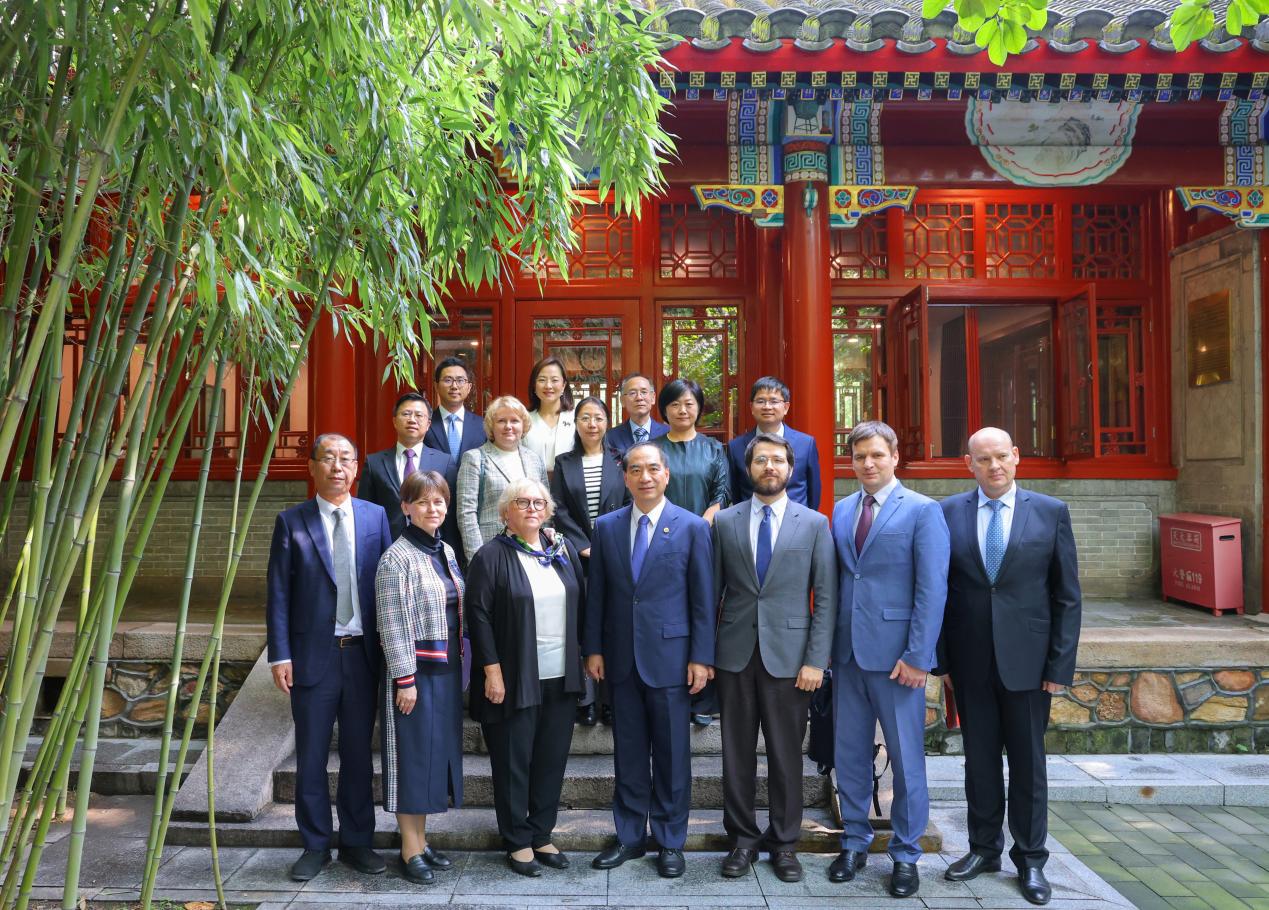 2025年10月13日,俄罗斯大学校长代表团到访北京大学。莫斯科语言大学校长克拉耶娃、俄罗斯国家研究型高等经济大学副校长巴雷舍夫、莫斯科国立师范大学副校长弗拉基米罗娃、俄罗斯赫尔岑师范大学副校长罗戈津娜、伏尔加格勒社会师范大学副校长阿托波夫、普希金俄语学院国际合作特别代表辛等随团来访。北京大学校长龚旗煌在临湖轩会见代表团一行,校领导姜国华陪同会见。