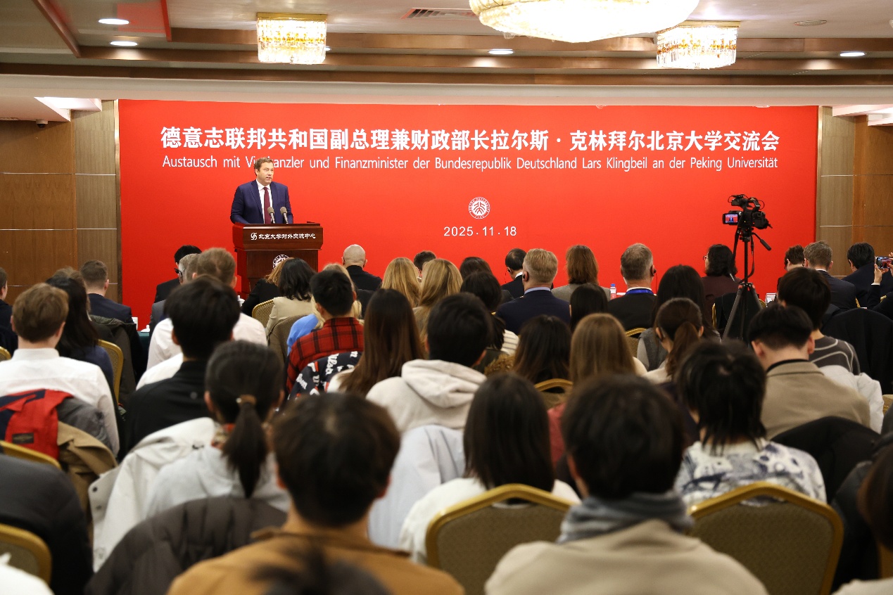 11月18日,德意志联邦共和国副总理兼财政部长拉尔斯·克林拜尔(Lars Klingbeil)率代表团访问北京大学并出席师生交流会。校党委书记、校务委员会主任何光彩在英杰交流中心会见来宾并出席活动。德国财政部国务秘书雅奈特·施华姆贝尔格(Jeanette Schwamberger)、驻华大使傅融(Patricia Flor)等随团来访,中国财政部国际经济关系司副司长杨剑敏陪同来访。校领导方方陪同出席。