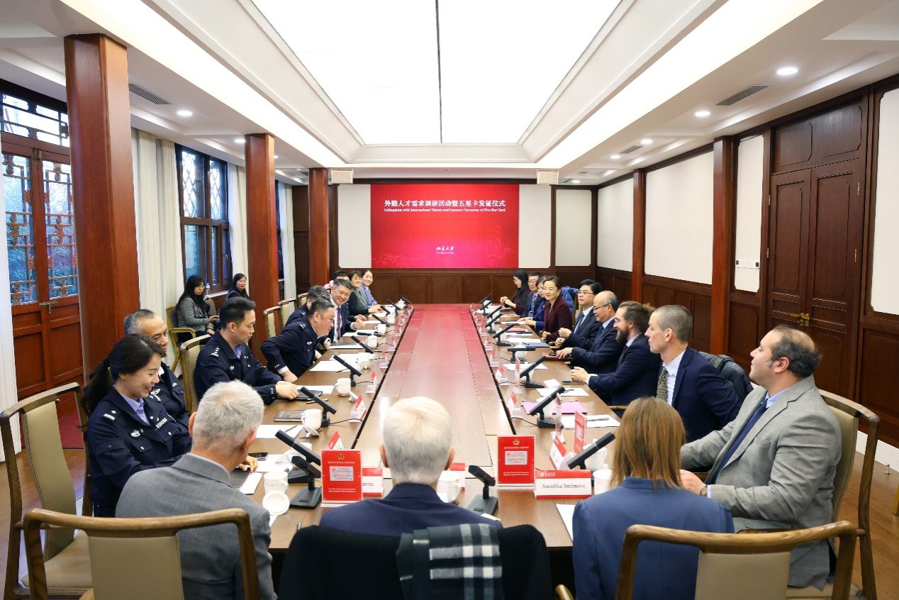 12月23日下午,外籍人才需求调研活动暨五星卡发证仪式在北京大学治贝子园北厅举行。本次活动由北京市公安局、北京市人才工作局与北京大学共同主办,旨在为在京外籍专家颁发五星卡,并听取用人单位和外籍人才对引才服务与出入境政策的意见建议。北京市公安局、北京市人才工作局、北京大学、中国外文局、中国日报社等单位领导及多位在京外籍专家学者共同出席活动。
