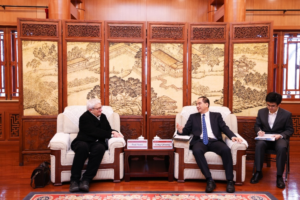 龚旗煌对纳斯爵士再次访问北京大学表示欢迎,并介绍了学校在学科布局、人才培养以及校区建设等方面的最新进展。他表示,北京大学高度重视基础研究和前沿科学发展,长期以来与英国学术界,尤其是多所享誉世界的顶尖英国大学保持着务实而长久的合作关系。希望以此次访问为契机,进一步深化北京大学与英国皇家学会在生命科学、科研平台建设以及青年人才培养等领域的交流合作。