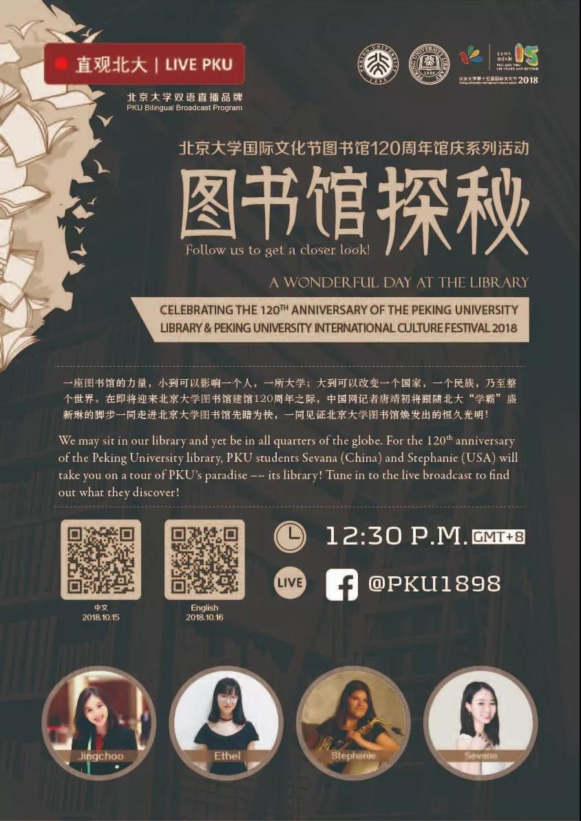 双语直播节目将在北京大学官方Facebook账号(@PKU1898)和媒体合作伙伴中国网同步直播。请屏幕前的你一同体验传统书香气与先进科技的融合运用,也一同见证北京大学图书馆焕发出的恒久光明!10月15日(中文)、10月16日(英文)12:30识别下方二维码,即可观看直播。
