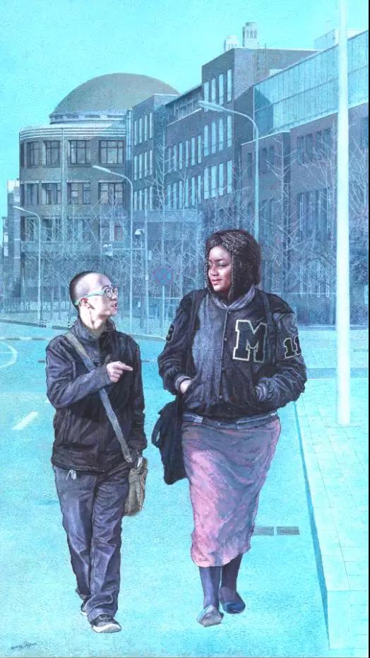作品《兼容并包》是北大国际视野的一个缩影。初冬的北大校园里枯叶飘零,街边树木空留枝桠。近年来新建的经济学院,与两名不同相貌、身高、肤色的学生的身影交相辉映,奏出国际化的美妙乐章。一名非洲面孔的留学生与她的中国同学闲适地漫步在校园中,愉悦地分享着什么有趣的话题,相谈甚欢。冬日凛冽的蓝色调背景极大地放大了冰冷的感官,而两名来自不同国家,分属不同民族的学生跨越语言、文化的障碍轻松交谈的融洽气氛,却给画作带来一股暖流。一冷一热之间形成了巨大的张力,暗示不同文化的和谐相处、求同存异和自然相融,体现了“兼容并包”的北大精神。
