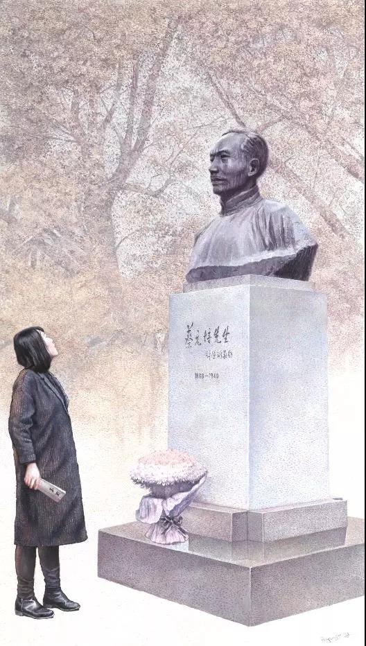 蔡元培先生于1916年至1927年期间担任北京大学校长,是北京大学乃至中国高等教育史上最为杰出的教育家之一。由北大校友合资捐建的蔡元培雕像成为了校园中极负盛名的一枚地标。画面中一名女学生伫立在蔡元培像前仰望雕像,雕像前放置着鲜花,女学生手中紧握着一本承载了中国历史精神魅力的史学著作《汉书》,表达了北大学子对于作为北京大学与中国高等教育崇高精神象征的蔡元培先生永久而深切的缅怀。画作以偏暖色调的黄色晕染奠定了稳重深沉的基调,整体上给人一种温暖静谧而又富有历史厚重深刻之感,传达了敬仰蔡元培校长的精神寓意。