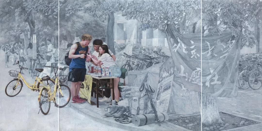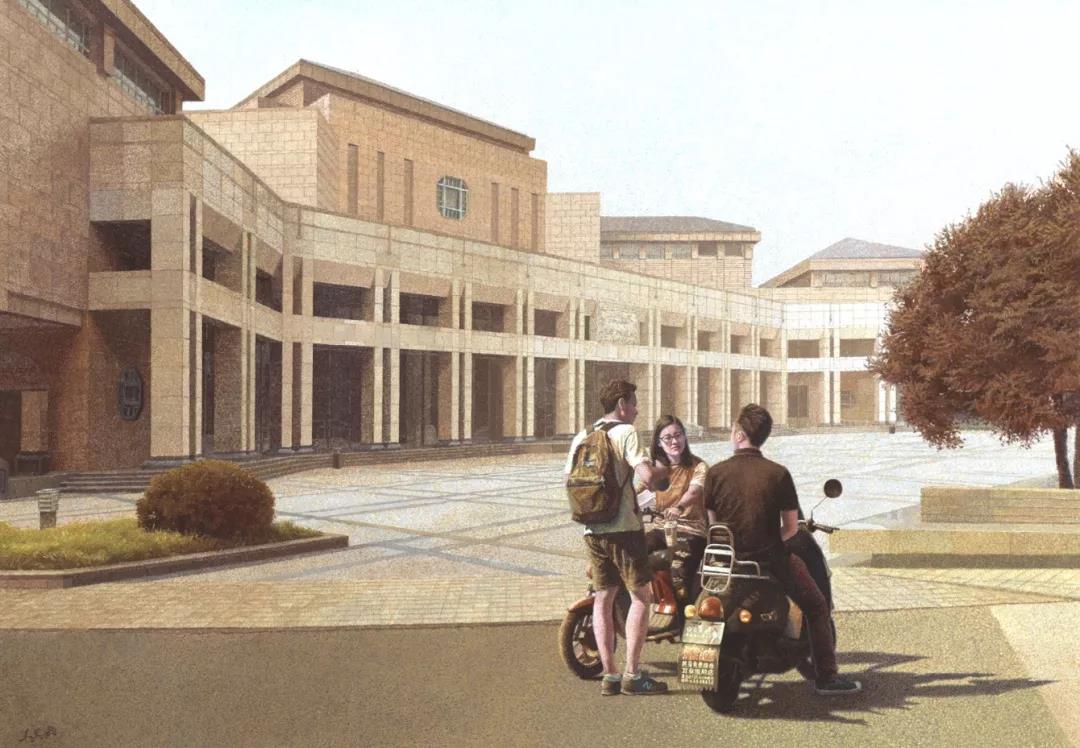 远景宏伟的建筑、中景的花坛与树木、近景三位正在交谈的学生,构成了这幅画作的表现主体。画中地点被称为“三角地”,是历史上学生活动的集中地;画中建筑是北京大学百周年纪念讲堂,它崛起于北京大学百年校庆之际,是北京大学的地标性建筑之一。画面前景三人热切交谈,电动摩托车、双肩包、挂在车把手上的咖啡杯、电动车脚踏板上放置的袋子……寻常的生活场景使得画作充满了真实的生活气息;电动车挡泥板上的广告、女生的破洞牛仔裤、男生脚上的“新百伦”运动鞋等细节都刻画出了鲜明的时代性。画作通过旁观者叙述视角走进这一场景,在光影及色彩的处理上呈现出胶片质感,完成了真实可感的视觉叙事。