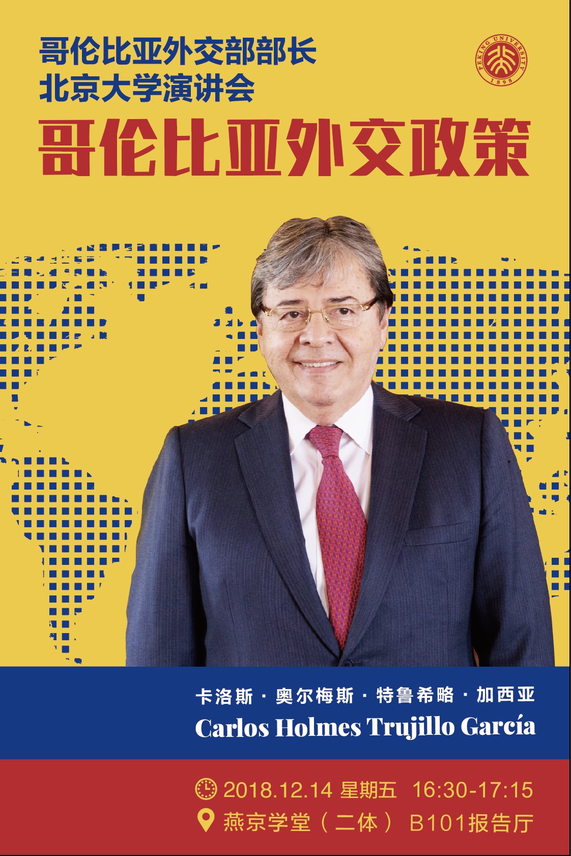 哥伦比亚外交部部长卡洛斯·奥尔梅斯·特鲁希略·加西亚(Carlos Holmes Trujillo García)将于2018年12月14日(周五)下午在我校举办演讲会,演讲内容将围绕哥伦比亚外交政策,欢迎感兴趣的师生参加。
