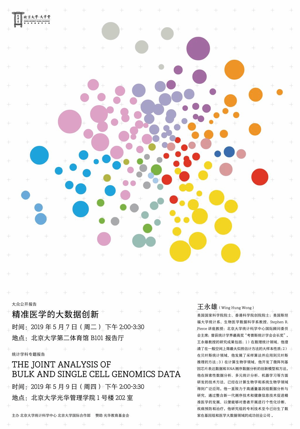 应北京大学“大学堂”顶尖学者讲学计划的邀请,美国国家科学院院士、香港科学院创院院士;美国斯坦福大学统计系、生物医学数据科学系教授、Stephen R. Pierce讲座教授王永雄(Wing Hung Wong)于2019年5月访问我校,并发表公开演讲。