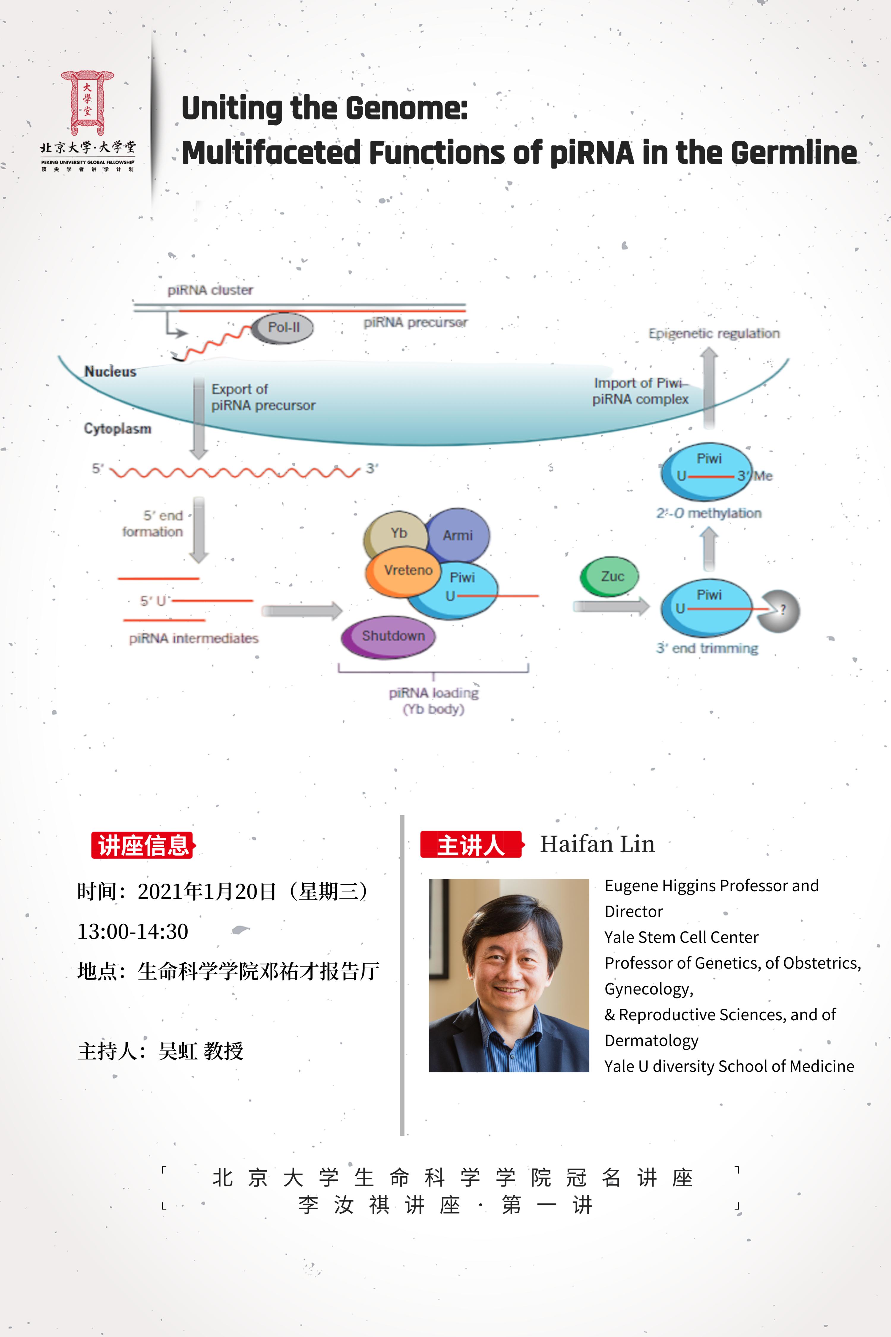 应北京大学“大学堂”顶尖学者讲学计划的邀请,耶鲁大学尤金.希金斯讲席教授(终身),耶鲁大学干细胞中心创始主任,美国科学院院院士、美国人文与科学院院士林海帆于2021年1月访问我校,并发表演讲。此次讲座为生命科学学院冠名讲座,李汝祺讲座第一讲。