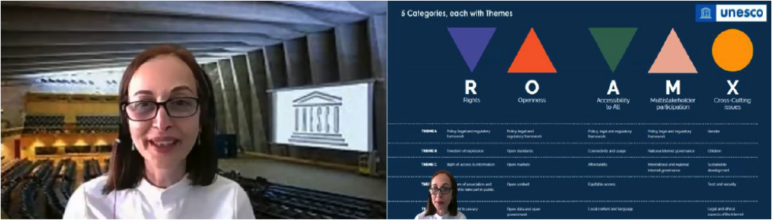 欧敏行博士首先介绍了联合国教科文组织在联合国系统中的定位与职能。她进一步阐释教科文组织在数字创新与变革领域发挥的作用。她表示,互联网改变了人类生活与工作方式,促进了信息流动和知识分享,但同时也造成了数字鸿沟。教科文组织致力于通过建立相关国际标准以消除不平等,确保普惠的和有意义的联通。她以联合国教科文组织开发的ROAM-X指标体系为例,说明该框架如何帮助各成员国评估本国互联网发展情况,制定政策、落实联合国可持续发展目标。